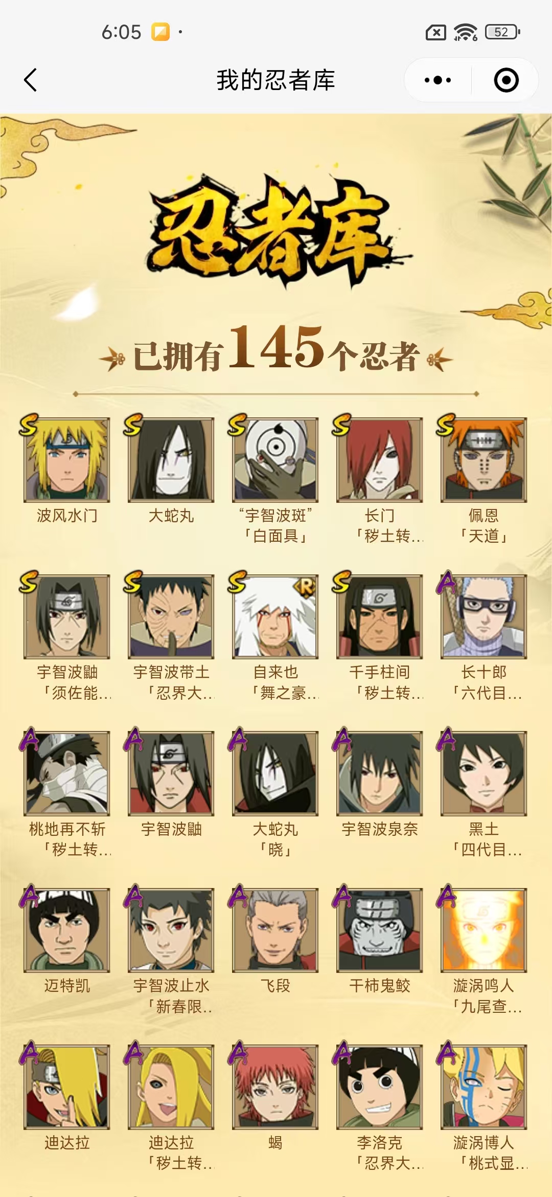 【A忍者】,长十郎「六代目水影」,不缘,日向宁次「忍界大战」,漩涡博人「桃式显现」,李洛克「忍界大战」,宇智波泉奈,神农「羁绊」,桃地再不斩「秽土转生」,波风水门「青年」,宇智波止水「新春限定」,宇智波佐助「须佐能乎」,迪达拉「秽土转生」,漩涡鸣人「九尾查克拉」,千代「近松十人卫」,秋道丁次「忍界大战」,大蛇丸「晓」,波风水门「新春限定」,照美冥「五代目水影」,宇智波佐助「万花筒写轮眼」,飞段「死司凭血」,飞段,迪达拉,我爱罗「疾风传」,蝎,干柿鬼鲛,宇智波鼬,猿飞阿斯玛,迈特凯,