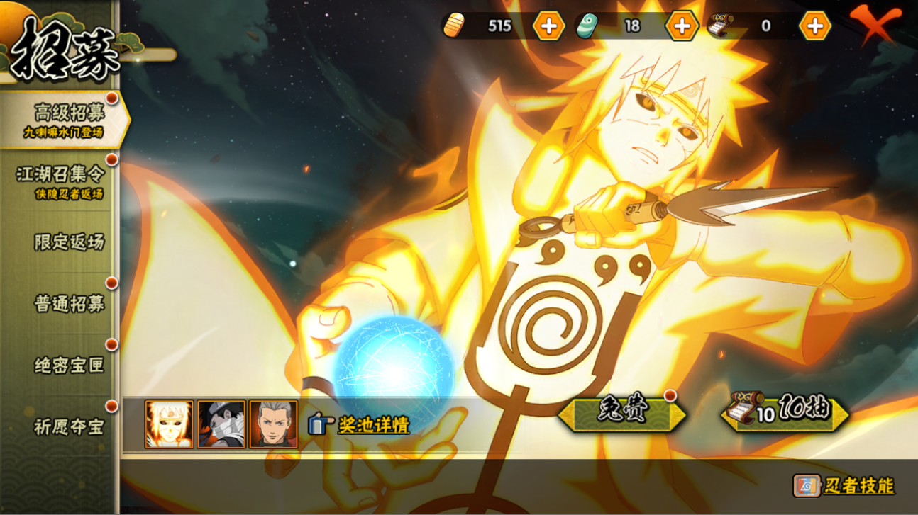 【S忍者】,宇智波止水「须佐能乎」,艾「忍界大战」,大筒木桃式,宇智波斑「秽土转生·解」,千手柱间「木叶创立」,宇智波佐助「永恒万花筒」,漩涡鸣人「九喇嘛连结」,宇智波带土「忍界大战」,千手柱间「秽土转生」,自来也「舞之豪杰」,旗木卡卡西「须佐能乎」,大筒木舍人「最终章」,自来也「传说中的三忍」,宇智波斑「秽土转生」,宇智波斑「白面具」,波风水门「秽土转生」,猿飞日斩「秽土转生」,宇智波鼬「须佐能乎」,佩恩「天道」,波风水门,大蛇丸,