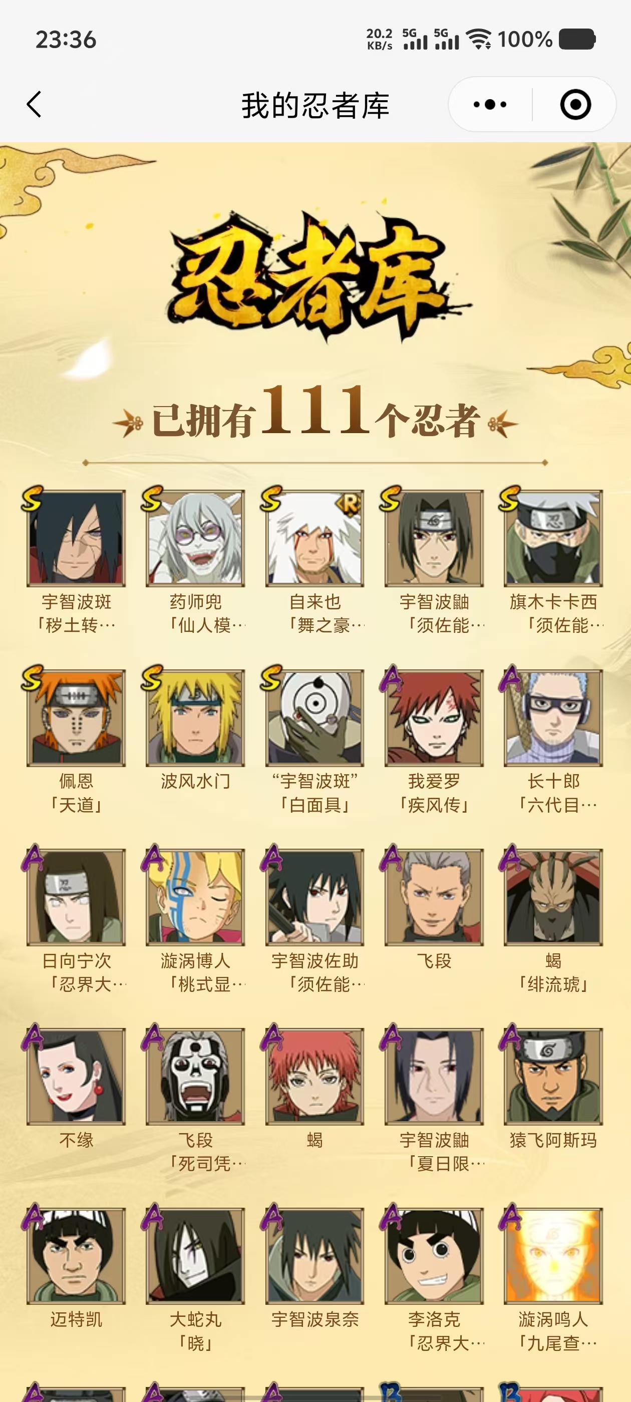 【A忍者】,长十郎「六代目水影」,不缘,日向宁次「忍界大战」,漩涡博人「桃式显现」,宇智波鼬「夏日限定」,李洛克「忍界大战」,蝎「绯流琥」,宇智波泉奈,宇智波佐助「须佐能乎」,漩涡鸣人「九尾查克拉」,大蛇丸「晓」,宇智波佐助「万花筒写轮眼」,飞段「死司凭血」,飞段,我爱罗「疾风传」,蝎,干柿鬼鲛,猿飞阿斯玛,迈特凯,桃地再不斩,