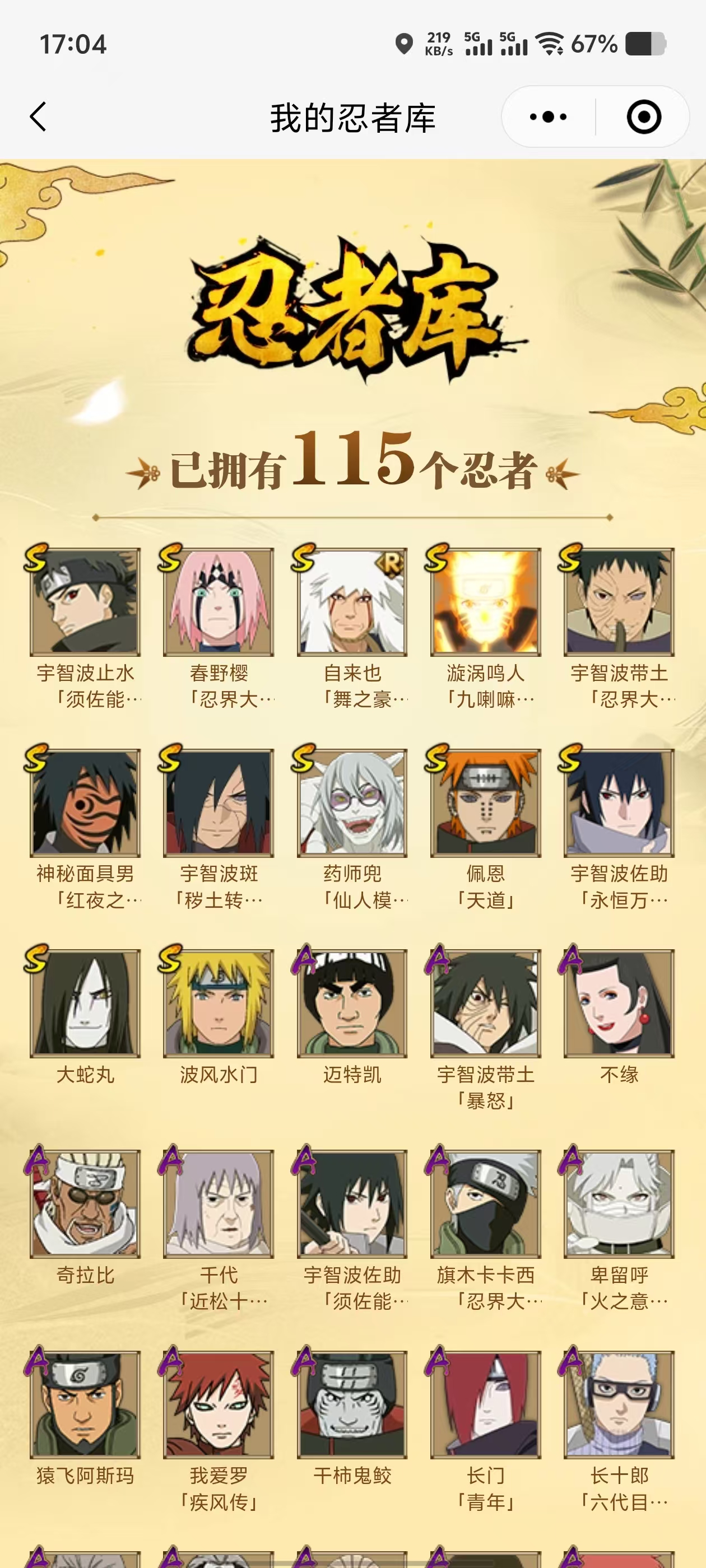 【A忍者】,长十郎「六代目水影」,不缘,日向宁次「忍界大战」,长门「青年」,艾「青年」,宇智波佐助「须佐能乎」,旗木卡卡西「忍界大战」,宇智波带土「暴怒」,千代「近松十人卫」,奇拉比,飞段「死司凭血」,飞段,我爱罗「疾风传」,蝎,干柿鬼鲛,猿飞阿斯玛,迈特凯,卑留呼「火之意志继承者」,
