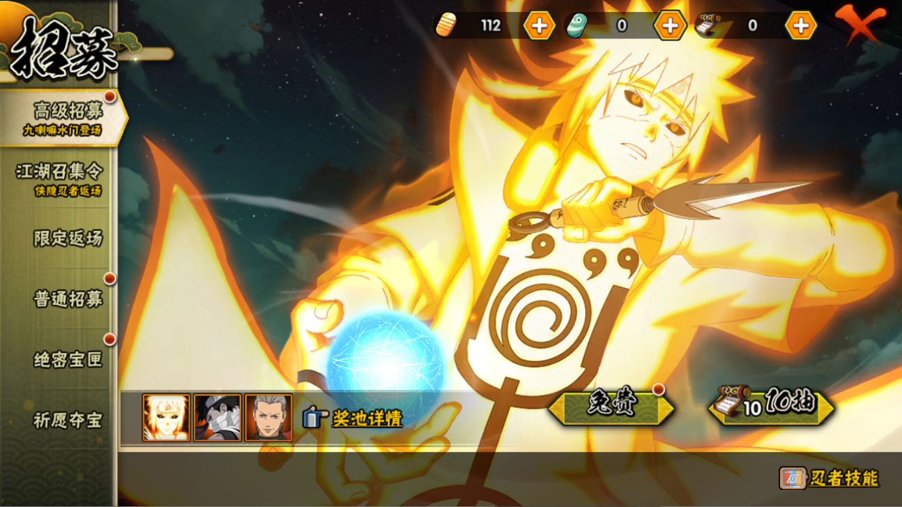 【S忍者】,宇智波斑「秽土转生·解」,宇智波佐助「永恒万花筒」,漩涡鸣人「九喇嘛连结」,迈特凯「死门」,宇智波带土「忍界大战」,自来也「舞之豪杰」,旗木卡卡西「须佐能乎」,自来也「传说中的三忍」,宇智波斑「白面具」,宇智波鼬「须佐能乎」,佩恩「天道」,波风水门,大蛇丸,