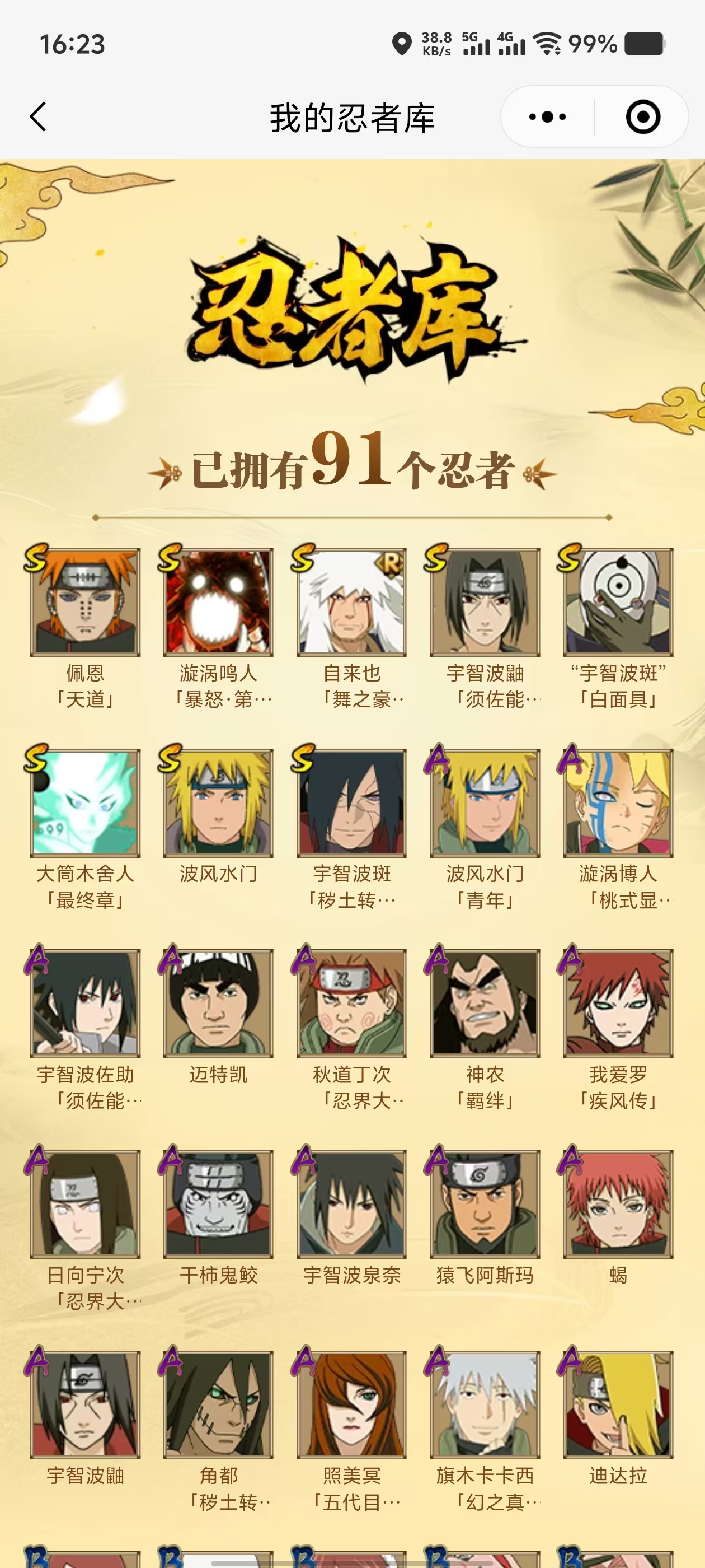 【A忍者】,日向宁次「忍界大战」,漩涡博人「桃式显现」,旗木卡卡西「幻之真容」,宇智波泉奈,神农「羁绊」,角都「秽土转生」,波风水门「青年」,宇智波佐助「须佐能乎」,秋道丁次「忍界大战」,照美冥「五代目水影」,迪达拉,我爱罗「疾风传」,蝎,干柿鬼鲛,宇智波鼬,猿飞阿斯玛,迈特凯,