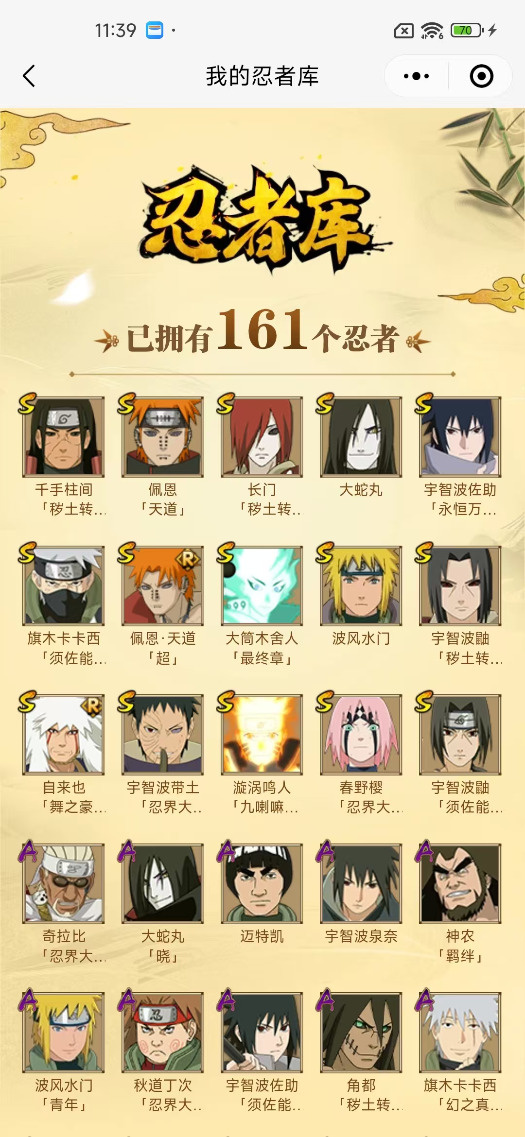 【A忍者】,长十郎「六代目水影」,旗木卡卡西「幻之真容」,李洛克「忍界大战」,宇智波泉奈,宇智波带土「漂泊浪客」,神农「羁绊」,桃地再不斩「秽土转生」,角都「秽土转生」,长门「青年」,艾「青年」,达鲁伊「五代目雷影」,波风水门「青年」,奇拉比「忍界大战」,宇智波佐助「须佐能乎」,迪达拉「秽土转生」,千代「近松十人卫」,秋道丁次「忍界大战」,大蛇丸「晓」,照美冥「五代目水影」,奇拉比,飞段「死司凭血」,飞段,迪达拉,我爱罗「疾风传」,蝎,干柿鬼鲛,宇智波鼬,猿飞阿斯玛,迈特凯,