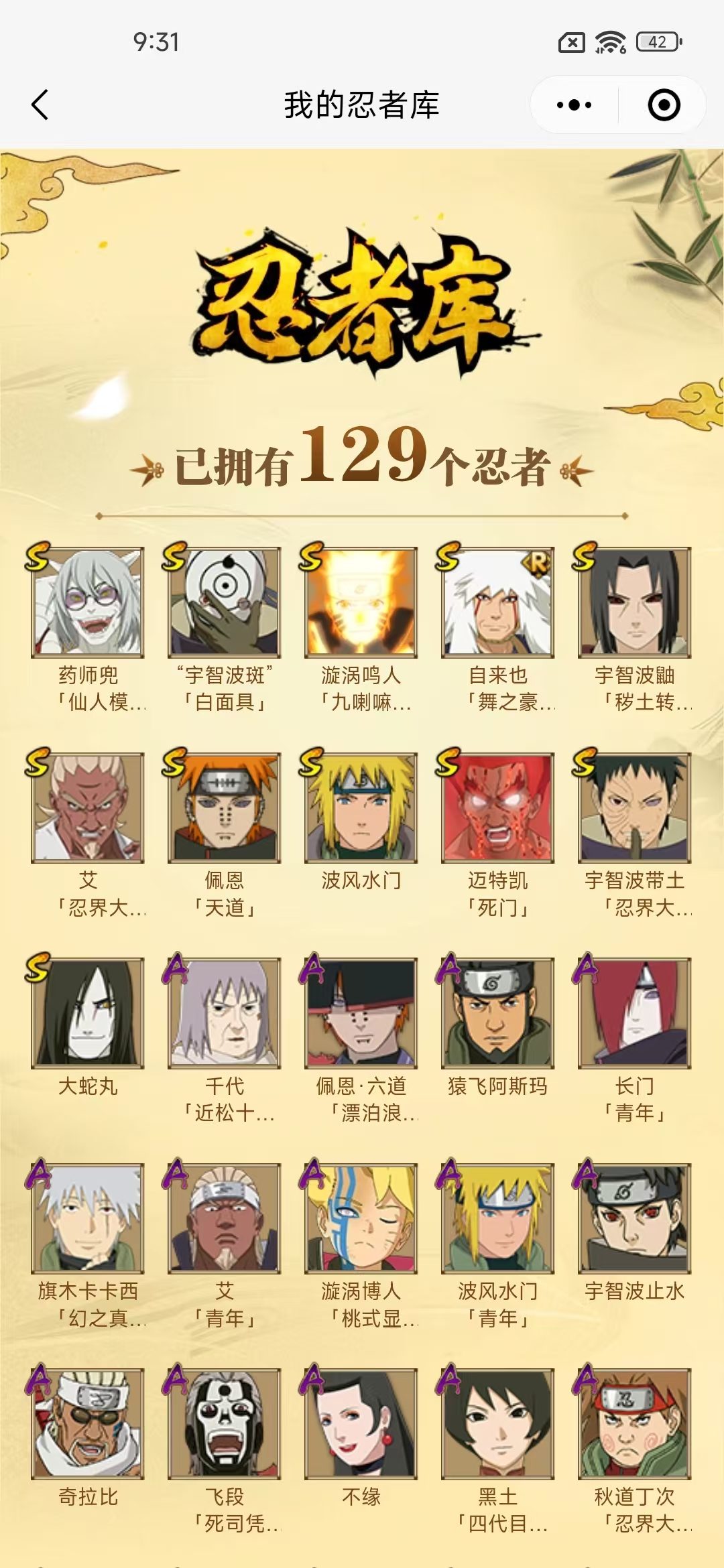 【A忍者】,药师兜「侠隐江湖」,不缘,漩涡博人「桃式显现」,旗木卡卡西「幻之真容」,宇智波止水,长门「青年」,佩恩·六道「漂泊浪客」,艾「青年」,波风水门「青年」,宇智波佐助「须佐能乎」,迪达拉「秽土转生」,千代「近松十人卫」,我爱罗「忍界大战」,秋道丁次「忍界大战」,照美冥「五代目水影」,奇拉比,飞段「死司凭血」,飞段,我爱罗「疾风传」,蝎,干柿鬼鲛,宇智波鼬,猿飞阿斯玛,迈特凯,