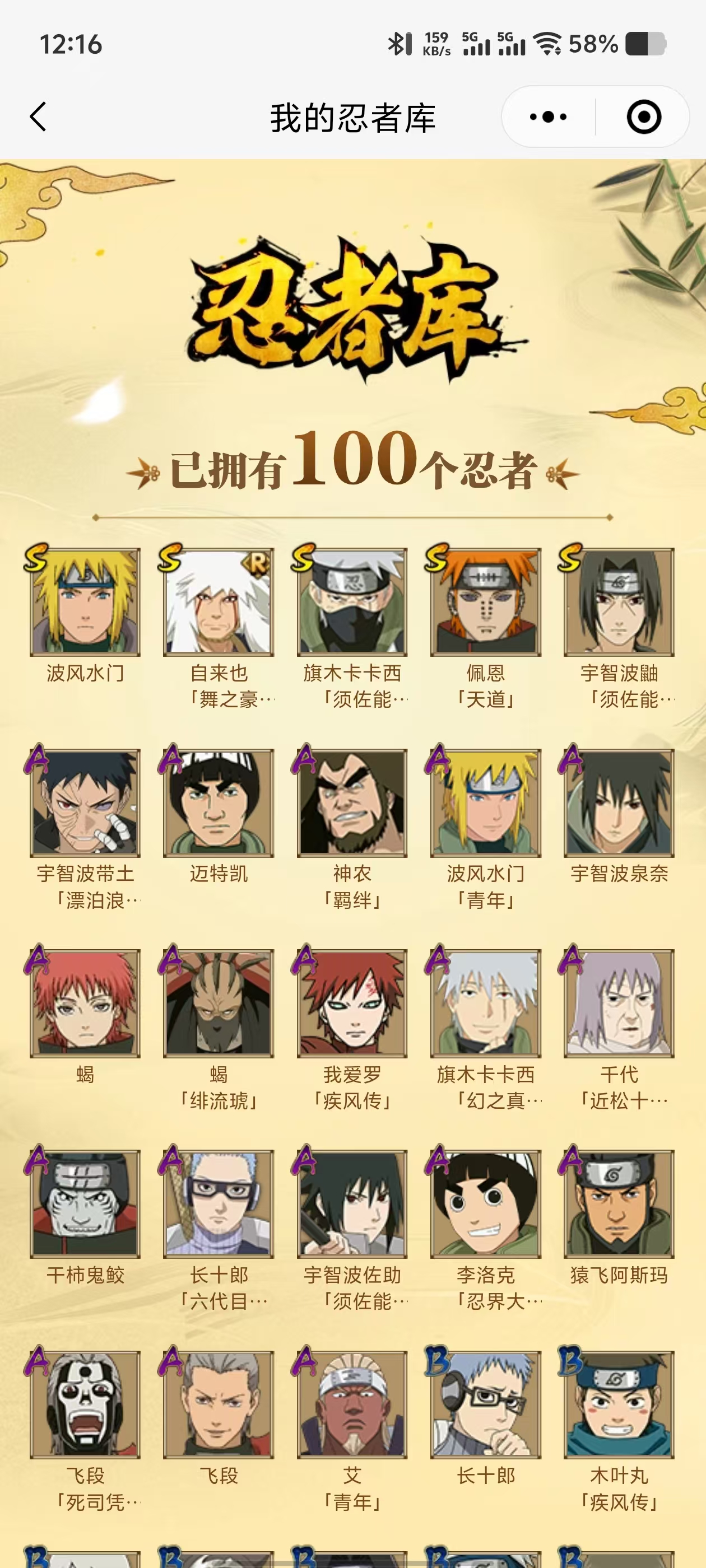 【A忍者】,长十郎「六代目水影」,旗木卡卡西「幻之真容」,李洛克「忍界大战」,蝎「绯流琥」,宇智波泉奈,宇智波带土「漂泊浪客」,神农「羁绊」,艾「青年」,波风水门「青年」,宇智波佐助「须佐能乎」,千代「近松十人卫」,飞段「死司凭血」,飞段,我爱罗「疾风传」,蝎,干柿鬼鲛,猿飞阿斯玛,迈特凯,