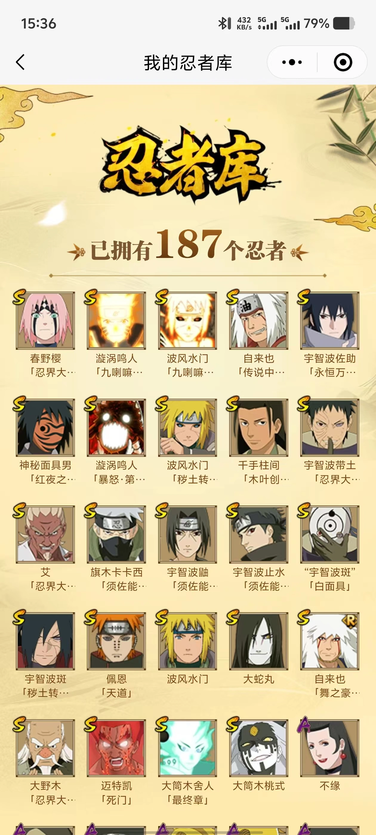 【A忍者】,土台「忍界大战」,长十郎「六代目水影」,不缘,日向宁次「忍界大战」,漩涡博人「桃式显现」,李洛克「忍界大战」,蝎「绯流琥」,宇智波泉奈,神农「羁绊」,桃地再不斩「秽土转生」,角都「秽土转生」,长门「青年」,佩恩·六道「漂泊浪客」,艾「青年」,达鲁伊「五代目雷影」,神秘面具男「忍者之路」,波风水门「青年」,宇智波佐助「须佐能乎」,迪达拉「秽土转生」,旗木卡卡西「忍界大战」,千代「近松十人卫」,秋道丁次「忍界大战」,大蛇丸「晓」,波风水门「新春限定」,猿飞日斩「火影继承人」,宇智波佐助「万花筒写轮眼」,志村团藏,奇拉比,飞段「死司凭血」,飞段,迪达拉,我爱罗「疾风传」,蝎,干柿鬼鲛,宇智波鼬,猿飞阿斯玛,迈特凯,桃地再不斩,
