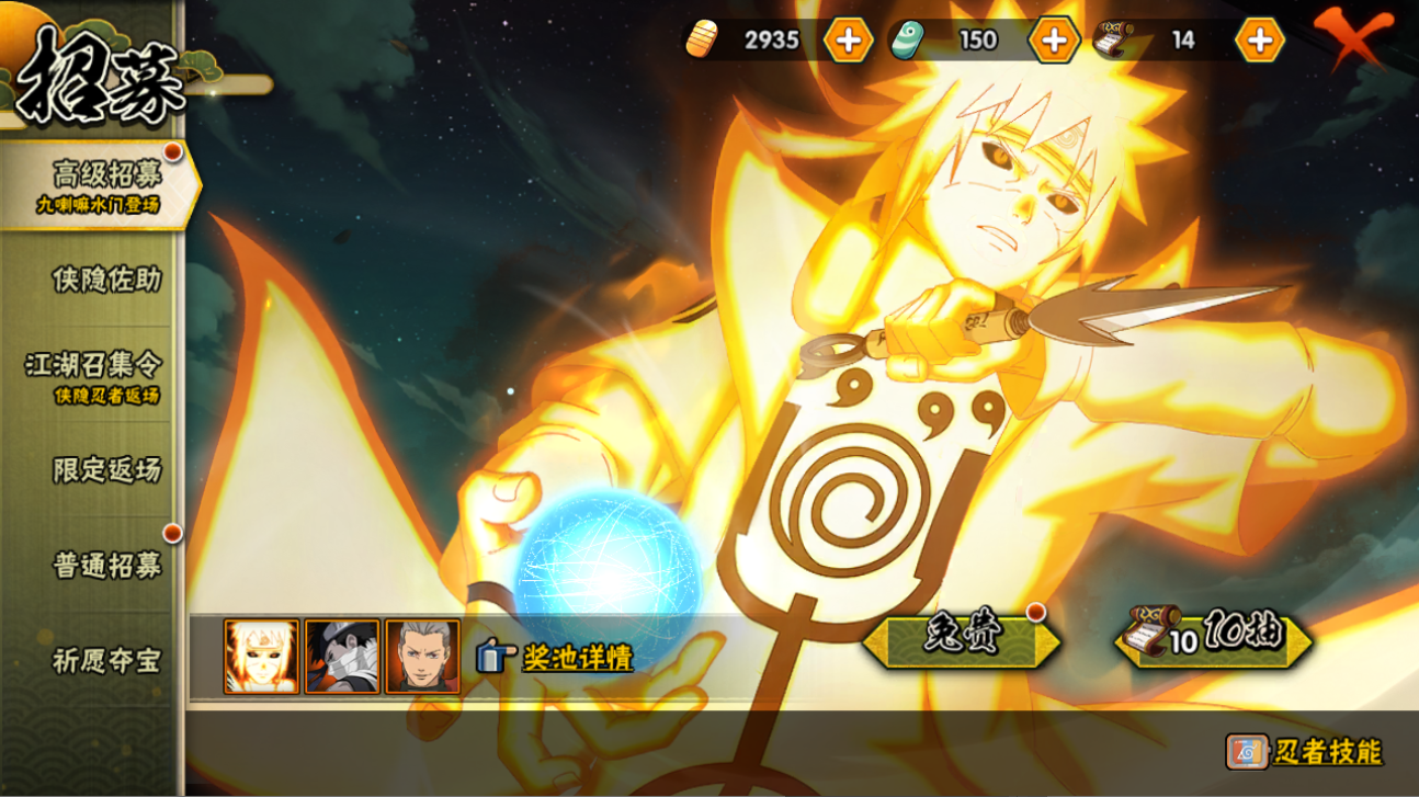 【S忍者】,漩涡鸣人「九喇嘛连结」,迈特凯「死门」,自来也「舞之豪杰」,自来也「传说中的三忍」,宇智波斑「白面具」,宇智波鼬「须佐能乎」,佩恩「天道」,波风水门,大蛇丸,