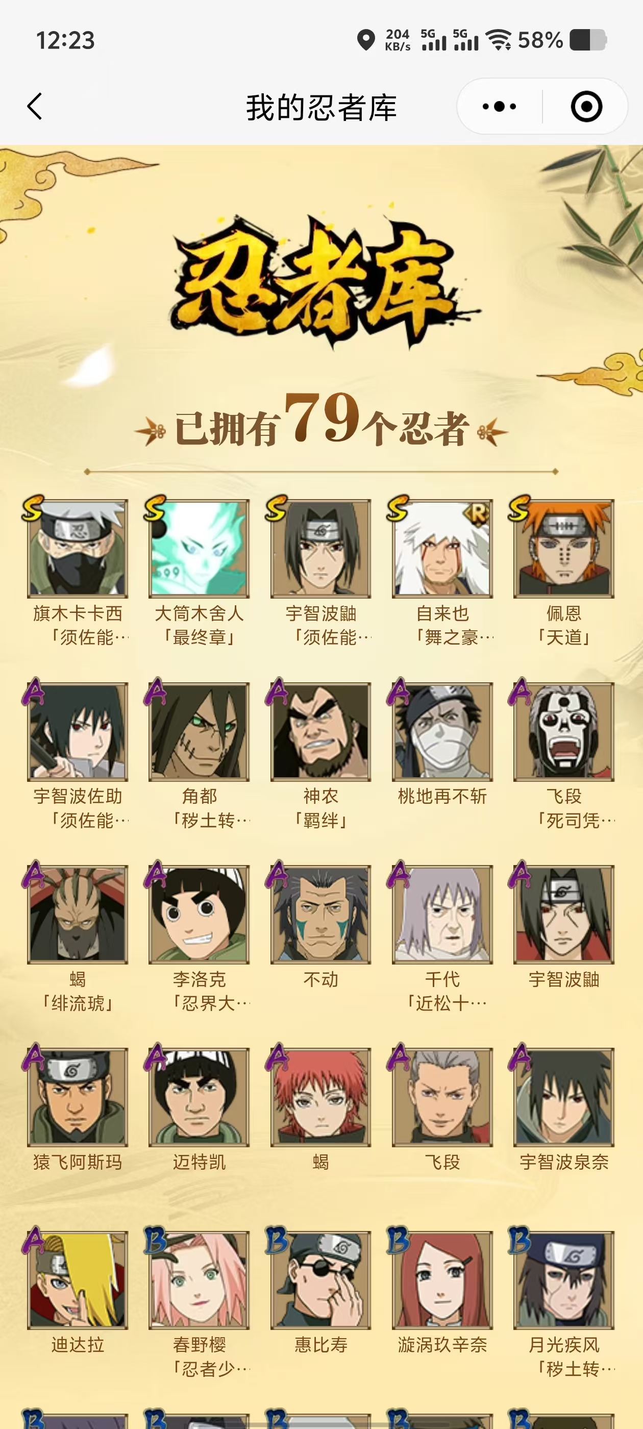 【A忍者】,李洛克「忍界大战」,不动,蝎「绯流琥」,宇智波泉奈,神农「羁绊」,角都「秽土转生」,宇智波佐助「须佐能乎」,千代「近松十人卫」,飞段「死司凭血」,飞段,迪达拉,蝎,宇智波鼬,猿飞阿斯玛,迈特凯,桃地再不斩,