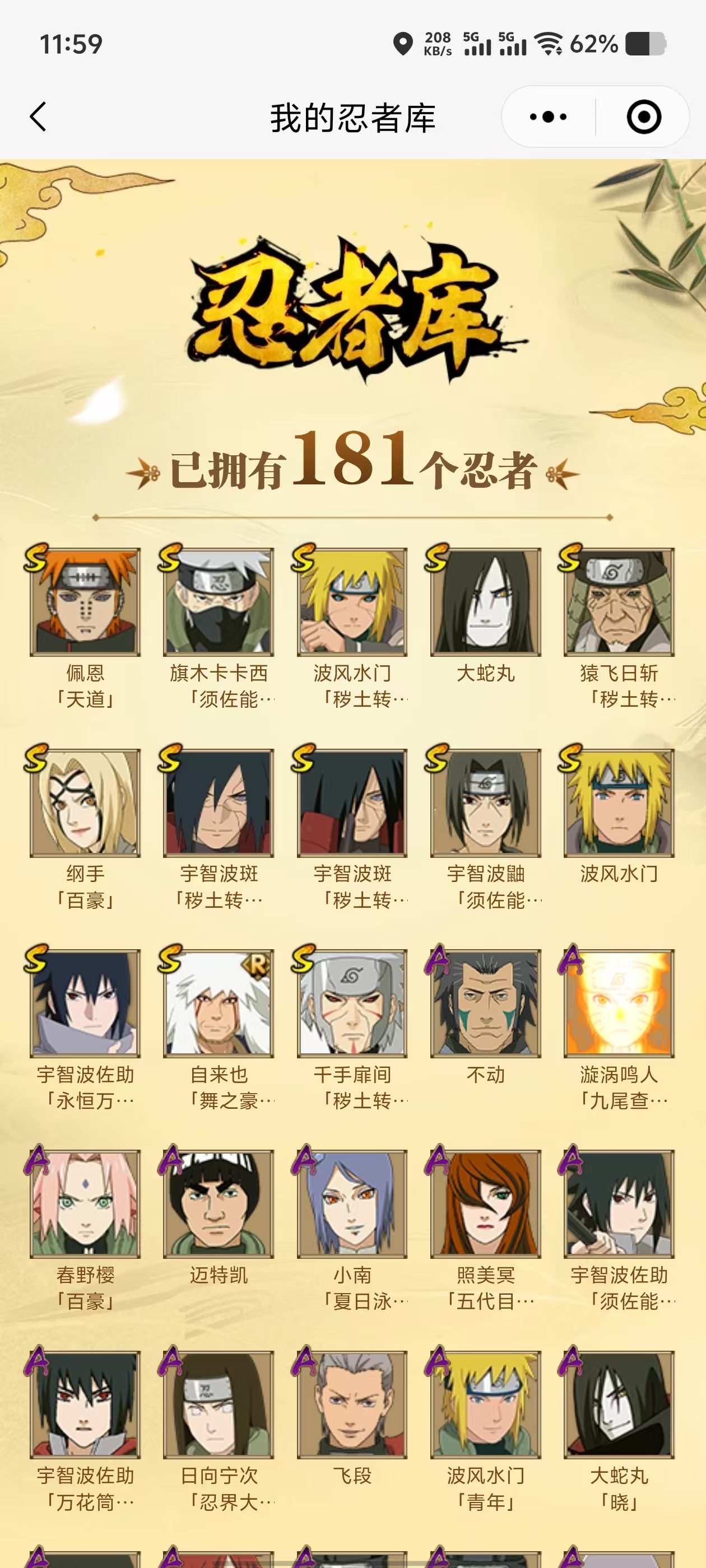 【A忍者】,长十郎「六代目水影」,日向宁次「忍界大战」,漩涡博人「桃式显现」,日向雏田「最终章」,李洛克「忍界大战」,不动,艾「青年」,波风水门「青年」,宇智波佐助「须佐能乎」,迪达拉「秽土转生」,照美冥「夏日泳装」,漩涡鸣人「九尾查克拉」,千代「近松十人卫」,药师兜「半蛇斗篷」,我爱罗「忍界大战」,小南「夏日泳装」,秋道丁次「忍界大战」,大蛇丸「晓」,春野樱「百豪」,照美冥「五代目水影」,宇智波佐助「万花筒写轮眼」,旗木卡卡西「万花筒写轮眼」,飞段「死司凭血」,飞段,迪达拉,我爱罗「疾风传」,蝎,干柿鬼鲛,宇智波鼬,猿飞阿斯玛,迈特凯,