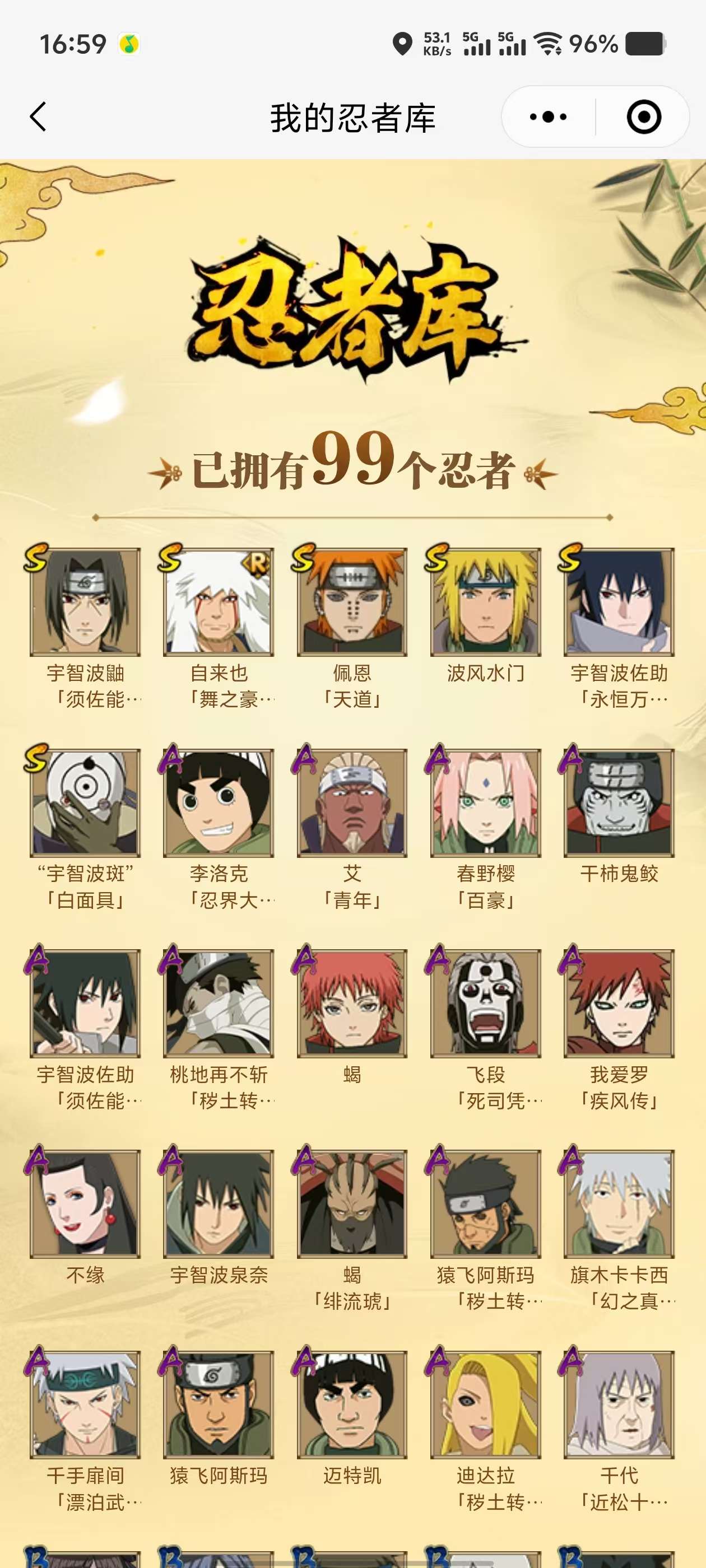 【A忍者】,不缘,旗木卡卡西「幻之真容」,李洛克「忍界大战」,蝎「绯流琥」,宇智波泉奈,桃地再不斩「秽土转生」,艾「青年」,千手扉间「漂泊武士」,宇智波佐助「须佐能乎」,迪达拉「秽土转生」,千代「近松十人卫」,猿飞阿斯玛「秽土转生」,春野樱「百豪」,飞段「死司凭血」,我爱罗「疾风传」,蝎,干柿鬼鲛,猿飞阿斯玛,迈特凯,
