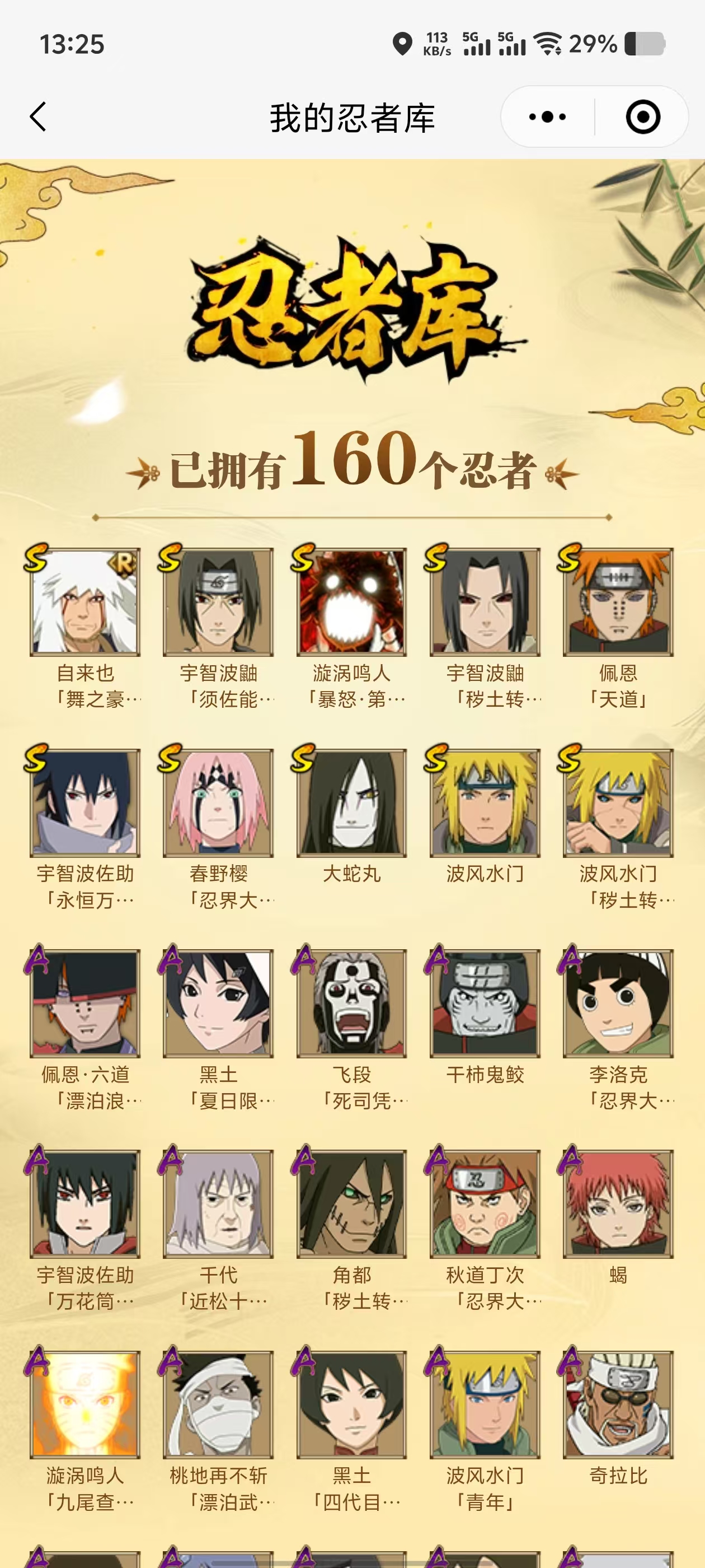 【A忍者】,不缘,日向宁次「忍界大战」,漩涡博人「桃式显现」,旗木卡卡西「幻之真容」,小南「漂泊浪客」,李洛克「忍界大战」,宇智波泉奈,宇智波带土「漂泊浪客」,神农「羁绊」,桃地再不斩「秽土转生」,角都「秽土转生」,佩恩·六道「漂泊浪客」,艾「青年」,波风水门「青年」,千手扉间「漂泊武士」,桃地再不斩「漂泊武士」,迪达拉「秽土转生」,漩涡鸣人「九尾查克拉」,千代「近松十人卫」,小南「夏日泳装」,秋道丁次「忍界大战」,大蛇丸「晓」,宇智波佐助「万花筒写轮眼」,奇拉比,飞段「死司凭血」,飞段,迪达拉,我爱罗「疾风传」,蝎,干柿鬼鲛,宇智波鼬,猿飞阿斯玛,迈特凯,