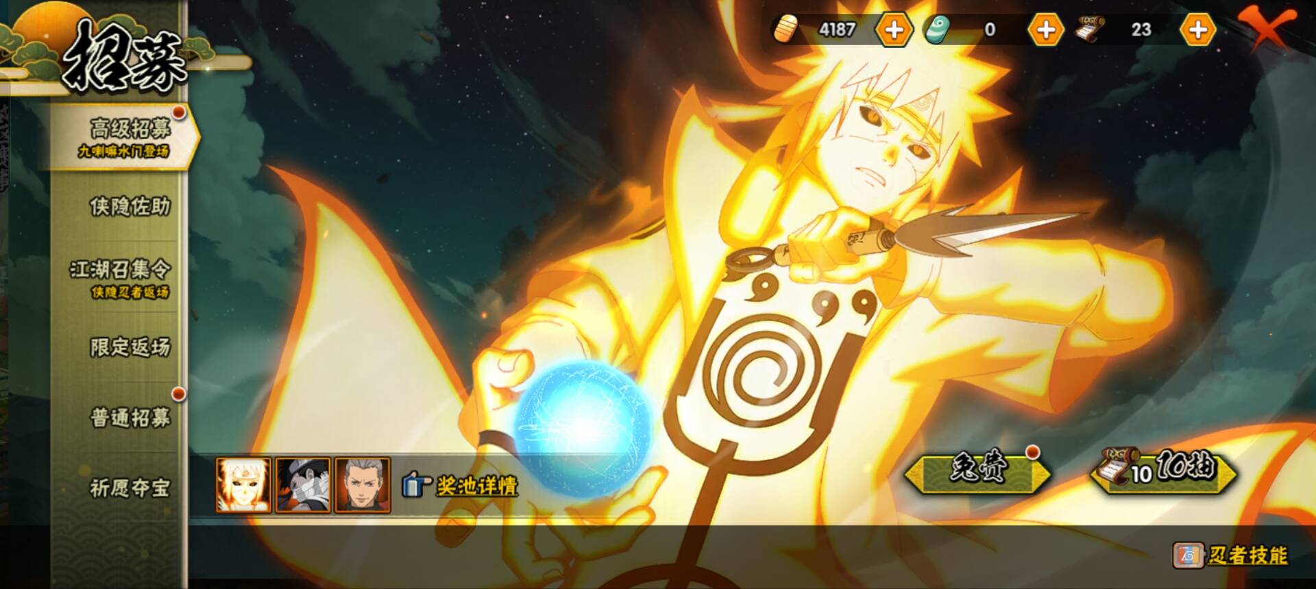 【S忍者】,宇智波斑「秽土转生·解」,千手柱间「木叶创立」,宇智波佐助「永恒万花筒」,神秘面具男「红夜之刃」,宇智波斑「木叶创立」,自来也「舞之豪杰」,旗木卡卡西「须佐能乎」,大筒木舍人「最终章」,自来也「传说中的三忍」,漩涡鸣人「暴怒·第六尾」,宇智波斑「白面具」,宇智波鼬「须佐能乎」,佩恩「天道」,波风水门,