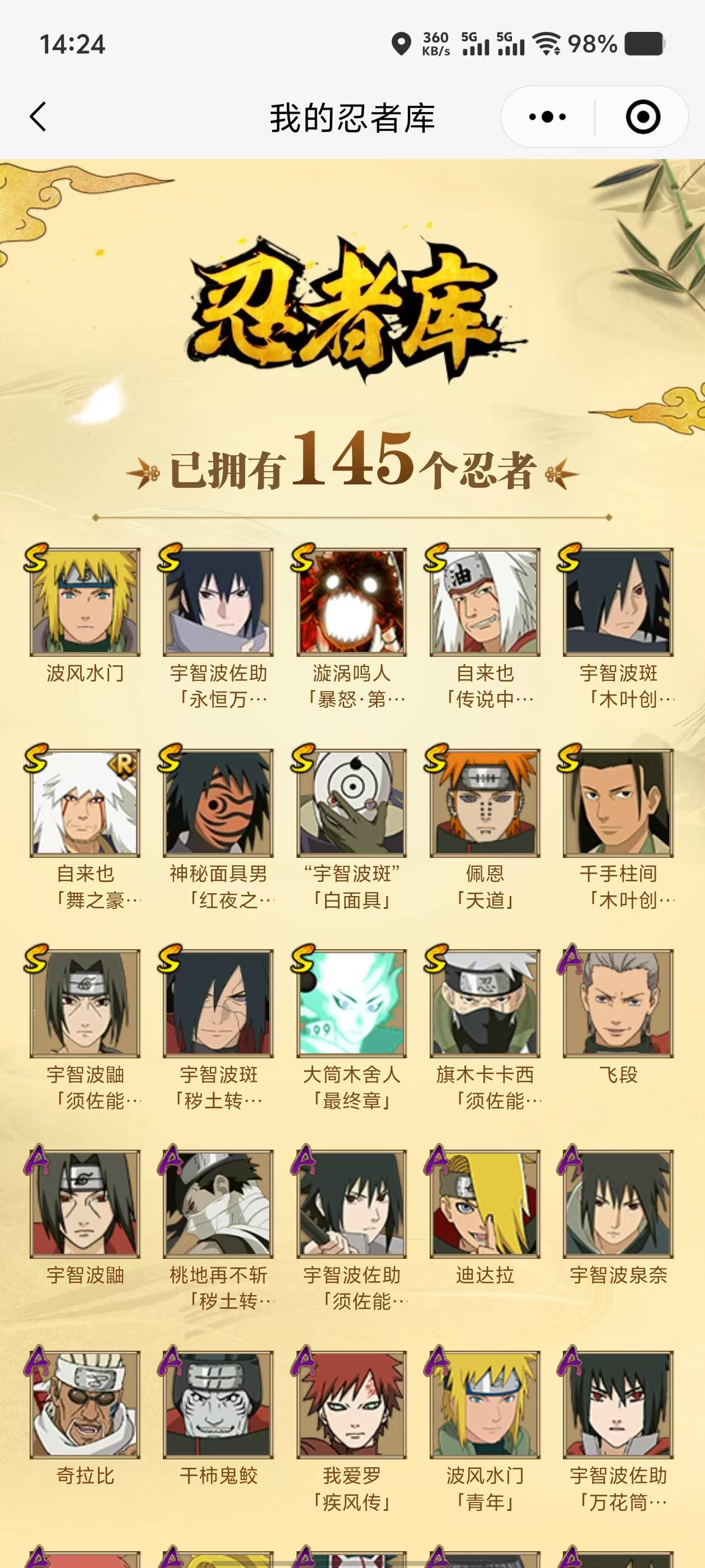 【A忍者】,长十郎「六代目水影」,日向宁次「忍界大战」,漩涡博人「桃式显现」,日向雏田「最终章」,旗木卡卡西「幻之真容」,蝎「绯流琥」,宇智波泉奈,神农「羁绊」,桃地再不斩「秽土转生」,角都「秽土转生」,神秘面具男「忍者之路」,波风水门「青年」,宇智波佐助「须佐能乎」,迪达拉「秽土转生」,角都「晓创生」,千代「近松十人卫」,秋道丁次「忍界大战」,宇智波佐助「万花筒写轮眼」,奇拉比,飞段「死司凭血」,飞段,迪达拉,我爱罗「疾风传」,蝎,干柿鬼鲛,宇智波鼬,猿飞阿斯玛,迈特凯,