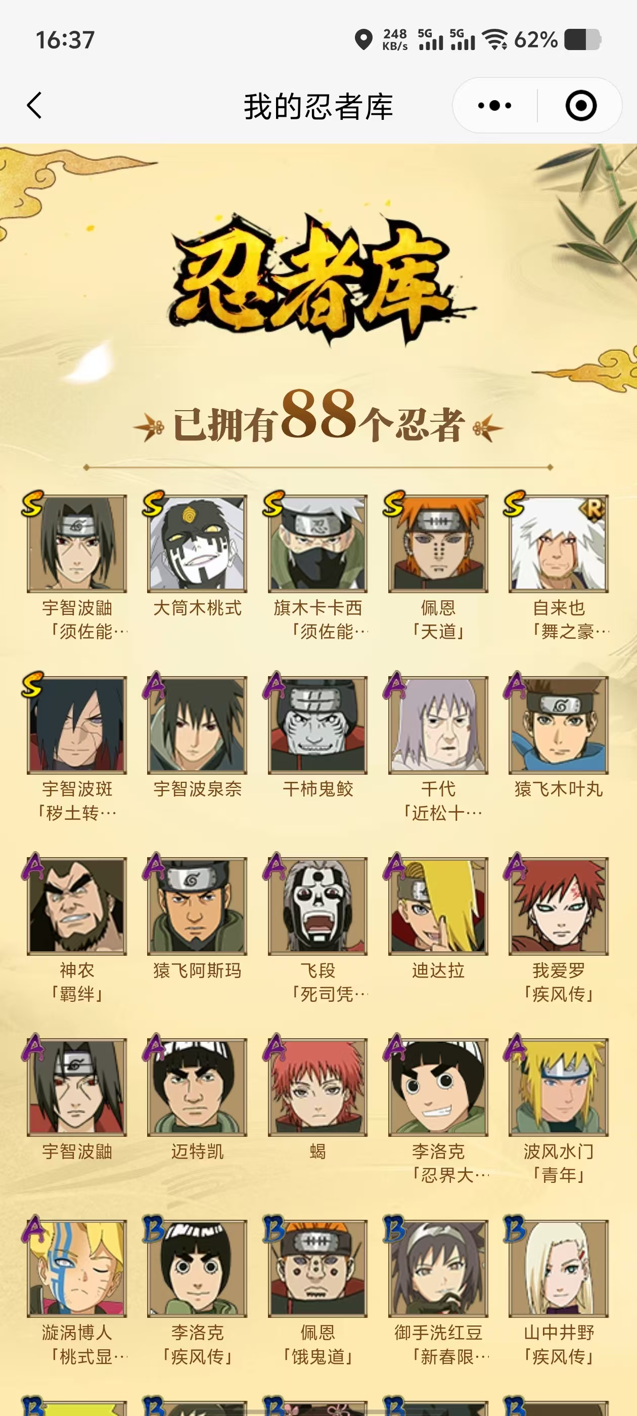 【A忍者】,漩涡博人「桃式显现」,李洛克「忍界大战」,宇智波泉奈,神农「羁绊」,波风水门「青年」,千代「近松十人卫」,飞段「死司凭血」,迪达拉,我爱罗「疾风传」,蝎,干柿鬼鲛,宇智波鼬,猿飞阿斯玛,迈特凯,