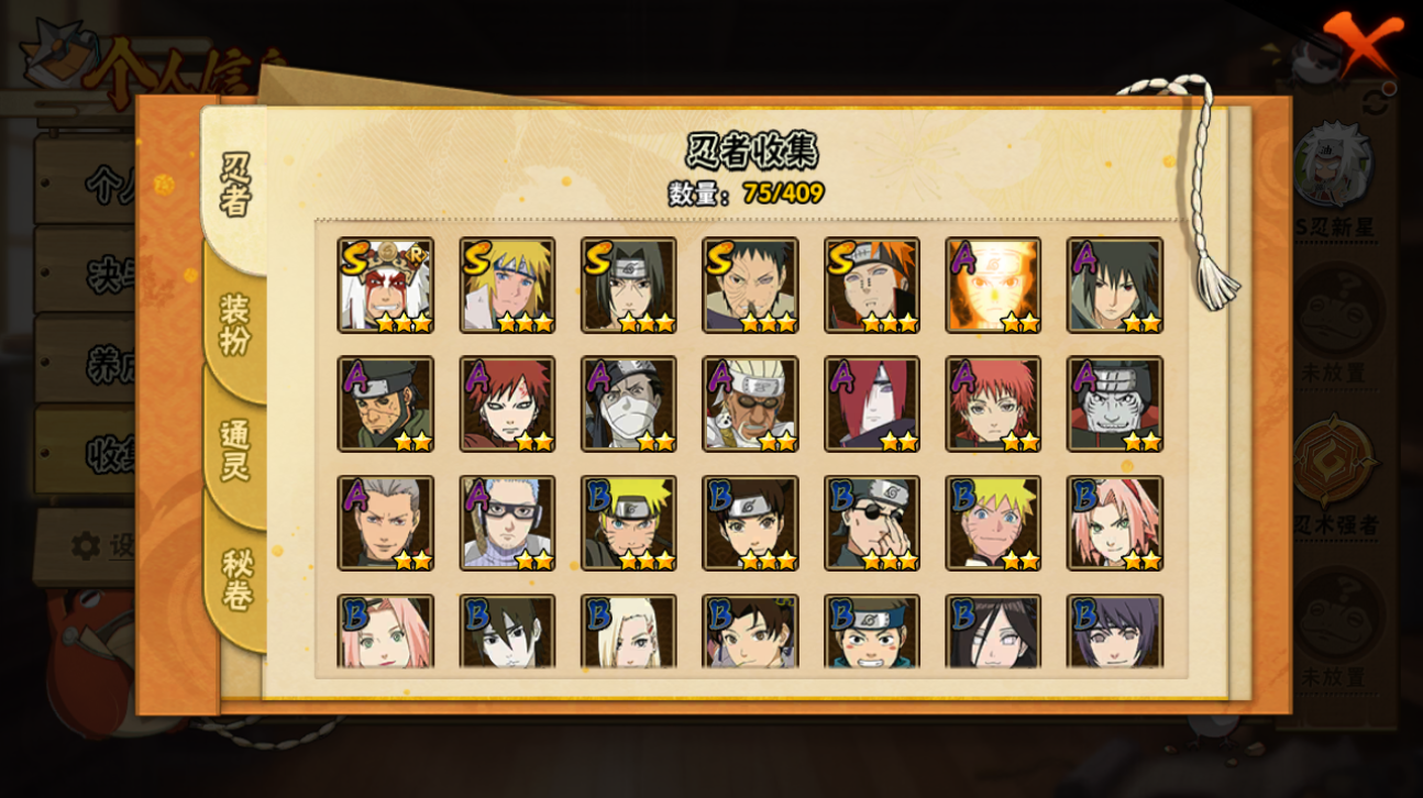 【A忍者】,宇智波泉奈,神农「羁绊」,不风,波风水门「青年」,宇智波佐助「须佐能乎」,迪达拉「秽土转生」,千代「近松十人卫」,地陆,秋道丁次「忍界大战」,宇智波佐助「万花筒写轮眼」,飞段「死司凭血」,迪达拉,蝎,干柿鬼鲛,宇智波鼬,猿飞阿斯玛,迈特凯,
