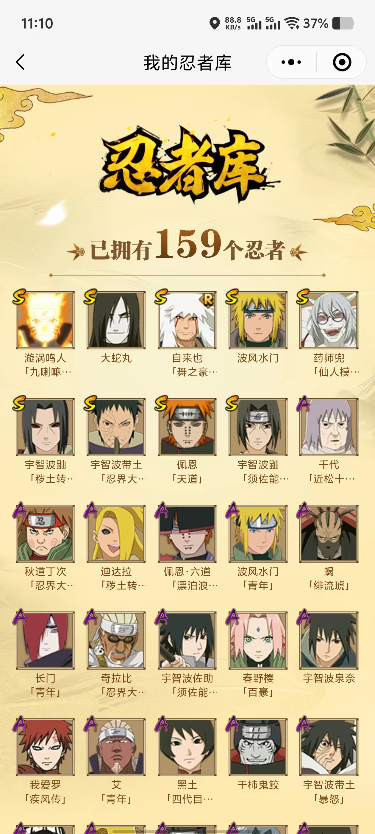 【A忍者】,漩涡博人「桃式显现」,蝎「绯流琥」,宇智波泉奈,角都「秽土转生」,长门「青年」,佩恩·六道「漂泊浪客」,艾「青年」,达鲁伊「五代目雷影」,波风水门「青年」,奇拉比「忍界大战」,宇智波止水「新春限定」,宇智波佐助「须佐能乎」,迪达拉「秽土转生」,宇智波带土「暴怒」,千代「近松十人卫」,宇智波佐助「疾风传咒印」,秋道丁次「忍界大战」,大蛇丸「晓」,春野樱「百豪」,宇智波佐助「万花筒写轮眼」,奇拉比,漩涡鸣人「仙人模式」,飞段「死司凭血」,飞段,迪达拉,我爱罗「疾风传」,蝎,干柿鬼鲛,猿飞阿斯玛,迈特凯,