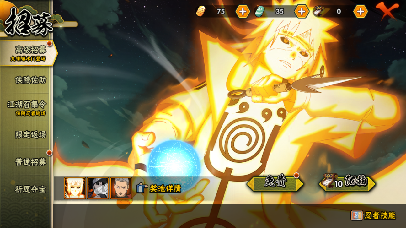 【S忍者】,宇智波止水「须佐能乎」,大筒木桃式,宇智波斑「秽土转生·解」,千手柱间「木叶创立」,宇智波佐助「永恒万花筒」,神秘面具男「红夜之刃」,春野樱「忍界大战」,漩涡鸣人「九喇嘛连结」,宇智波带土「忍界大战」,自来也「舞之豪杰」,旗木卡卡西「须佐能乎」,大筒木舍人「最终章」,漩涡鸣人「暴怒·第六尾」,药师兜「仙人模式」,宇智波斑「白面具」,波风水门「秽土转生」,宇智波鼬「须佐能乎」,佩恩「天道」,波风水门,