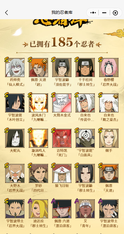 【S忍者】,春野樱「忍界大战」,大筒木金式,漩涡鸣人「九喇嘛连结」,大野木「忍界大战」,迈特凯「死门」,宇智波斑「木叶创立」,宇智波带土「忍界大战」,千手柱间「秽土转生」,罗砂「四代目风影」,自来也「舞之豪杰」,自来也「传说中的三忍」,宇智波鼬「秽土转生」,佩恩·天道「超」,药师兜「仙人模式」,宇智波斑「白面具」,宇智波鼬「须佐能乎」,佩恩「天道」,猿飞日斩,大蛇丸,纲手,波风水门「九喇嘛连结」,