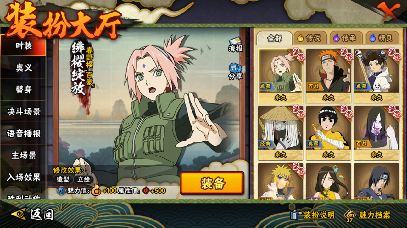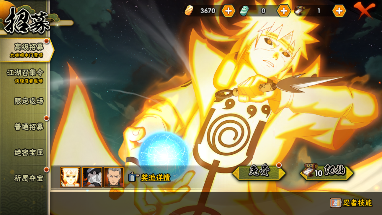 【S忍者】,宇智波止水「须佐能乎」,艾「忍界大战」,大筒木桃式,宇智波佐助「永恒万花筒」,漩涡鸣人「九喇嘛连结」,迈特凯「死门」,宇智波带土「忍界大战」,千手柱间「秽土转生」,自来也「舞之豪杰」,旗木卡卡西「须佐能乎」,大筒木舍人「最终章」,自来也「传说中的三忍」,漩涡鸣人「暴怒·第六尾」,宇智波斑「白面具」,波风水门「秽土转生」,猿飞日斩「秽土转生」,宇智波鼬「须佐能乎」,佩恩「天道」,波风水门,大蛇丸,