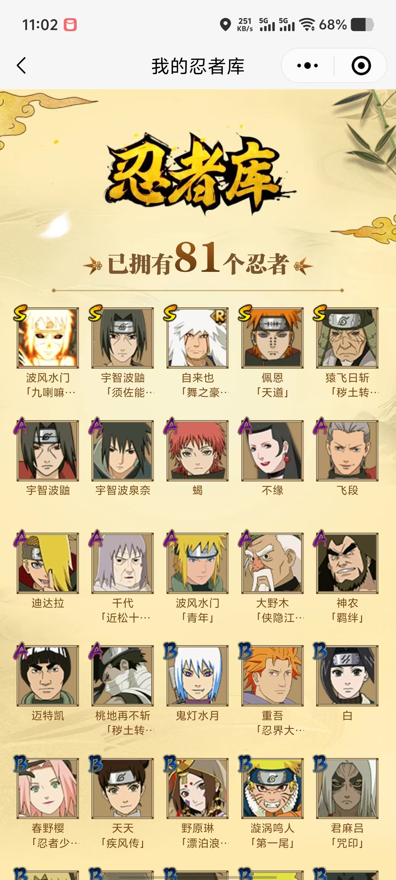 PX_2217798-5S忍/12A忍/战力337W/V1/区服4221 【S忍者】,自来也「舞之豪杰」,猿飞日斩「秽土转生」,宇智波鼬「须佐能乎」,佩恩「天道」,波风水门「九喇嘛连结」, 【A忍者】,不缘,宇智波泉奈,神农「羁绊」,桃地再不斩「秽土转生」,波风水门「青年」,千代「近松十人卫」,飞段,迪达拉,蝎,宇智波鼬,迈特凯,