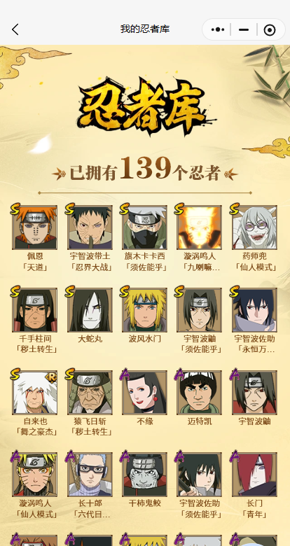 【A忍者】,长十郎「六代目水影」,不缘,旗木卡卡西「幻之真容」,李洛克「忍界大战」,长门「青年」,佩恩·六道「漂泊浪客」,达鲁伊「五代目雷影」,波风水门「青年」,奇拉比「忍界大战」,宇智波佐助「须佐能乎」,千代「近松十人卫」,我爱罗「忍界大战」,秋道丁次「忍界大战」,照美冥「五代目水影」,宇智波佐助「万花筒写轮眼」,漩涡鸣人「仙人模式」,飞段「死司凭血」,飞段,我爱罗「疾风传」,蝎,干柿鬼鲛,宇智波鼬,猿飞阿斯玛,迈特凯,