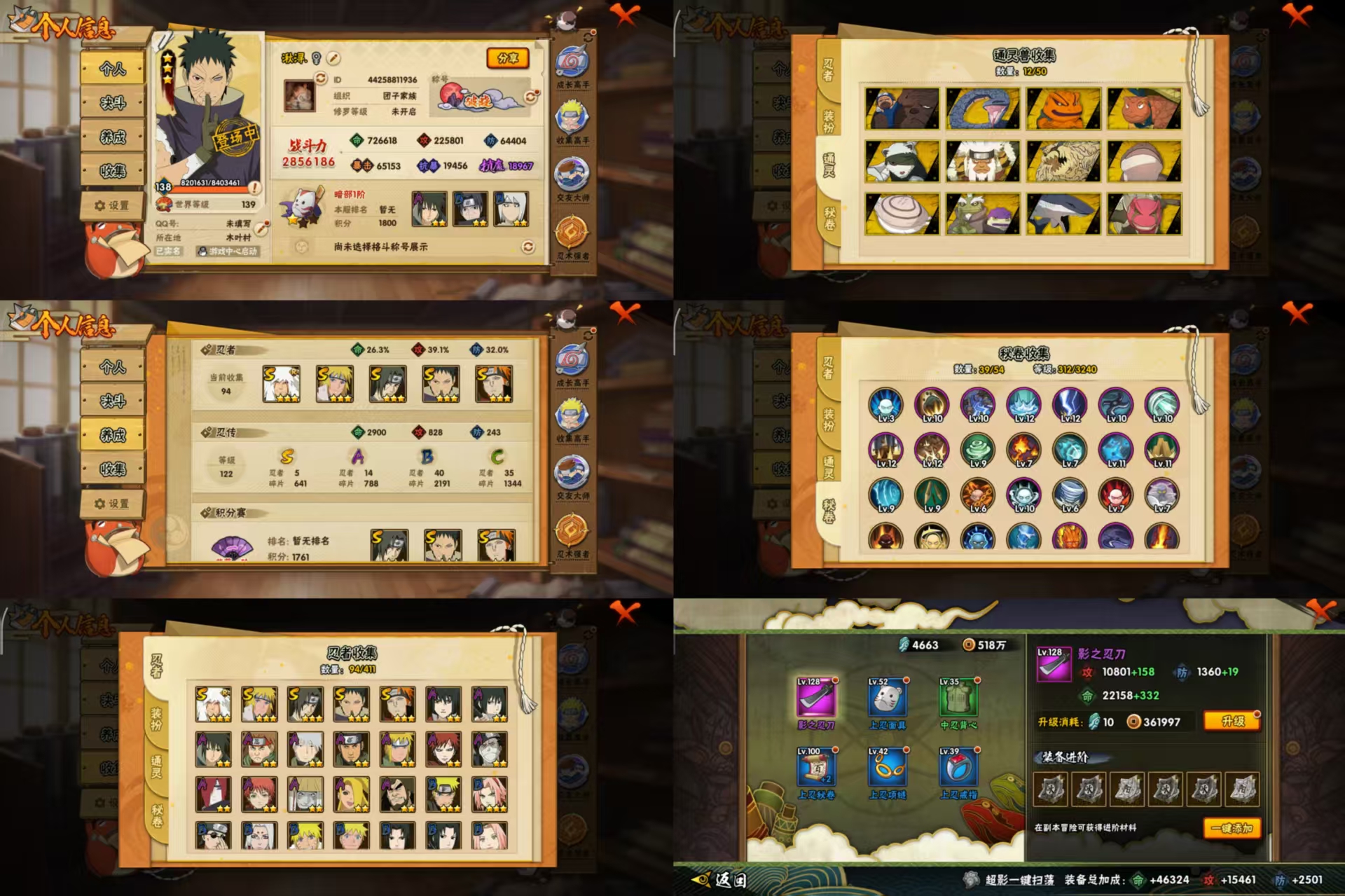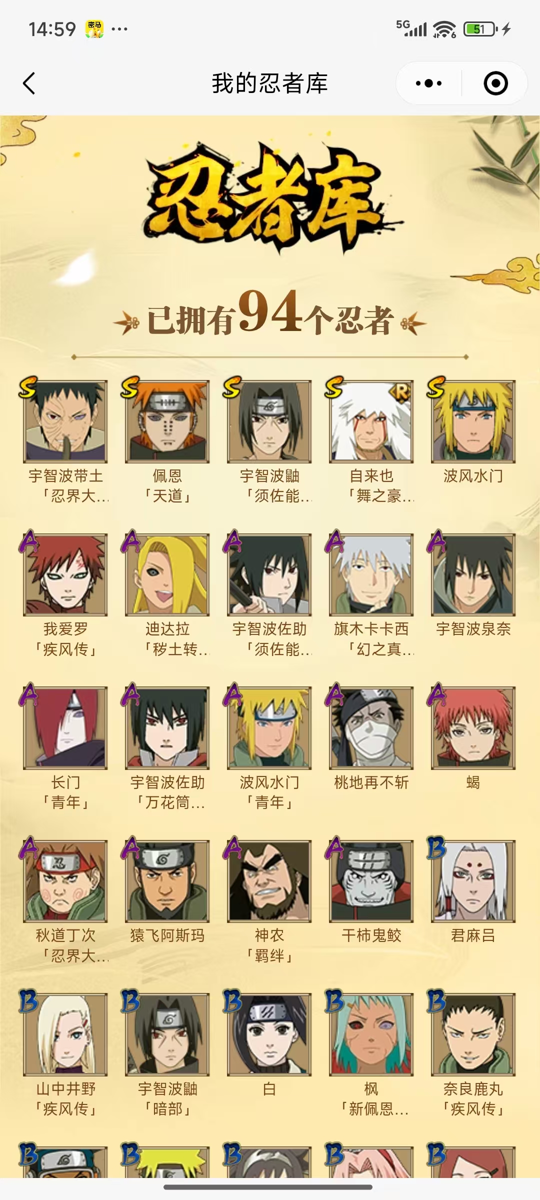 【A忍者】,旗木卡卡西「幻之真容」,宇智波泉奈,神农「羁绊」,长门「青年」,波风水门「青年」,宇智波佐助「须佐能乎」,迪达拉「秽土转生」,秋道丁次「忍界大战」,宇智波佐助「万花筒写轮眼」,我爱罗「疾风传」,蝎,干柿鬼鲛,猿飞阿斯玛,桃地再不斩,