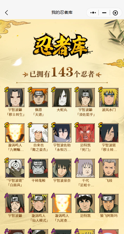 【A忍者】,日向宁次「忍界大战」,漩涡博人「桃式显现」,宇智波泉奈,桃地再不斩「秽土转生」,艾「青年」,波风水门「青年」,宇智波佐助「须佐能乎」,漩涡鸣人「九尾查克拉」,千代「近松十人卫」,药师兜「半蛇斗篷」,秋道丁次「忍界大战」,大蛇丸「晓」,宇智波佐助「万花筒写轮眼」,奇拉比,漩涡鸣人「仙人模式」,飞段「死司凭血」,飞段,我爱罗「疾风传」,蝎,干柿鬼鲛,宇智波鼬,猿飞阿斯玛,迈特凯,