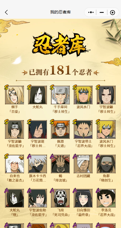 【A忍者】,漩涡博人「桃式显现」,日向雏田「最终章」,李洛克「忍界大战」,蝎「绯流琥」,宇智波泉奈,宇智波带土「漂泊浪客」,宇智波止水,长门「青年」,达鲁伊「五代目雷影」,波风水门「青年」,奇拉比「忍界大战」,宇智波佐助「须佐能乎」,迪达拉「秽土转生」,漩涡鸣人「九尾查克拉」,角都「晓创生」,千代「近松十人卫」,药师兜「半蛇斗篷」,我爱罗「忍界大战」,秋道丁次「忍界大战」,大蛇丸「晓」,春野樱「百豪」,波风水门「新春限定」,照美冥「五代目水影」,宇智波佐助「万花筒写轮眼」,志村团藏,奇拉比,漩涡鸣人「仙人模式」,旗木卡卡西「万花筒写轮眼」,飞段「死司凭血」,飞段,我爱罗「疾风传」,蝎,干柿鬼鲛,猿飞阿斯玛,迈特凯,