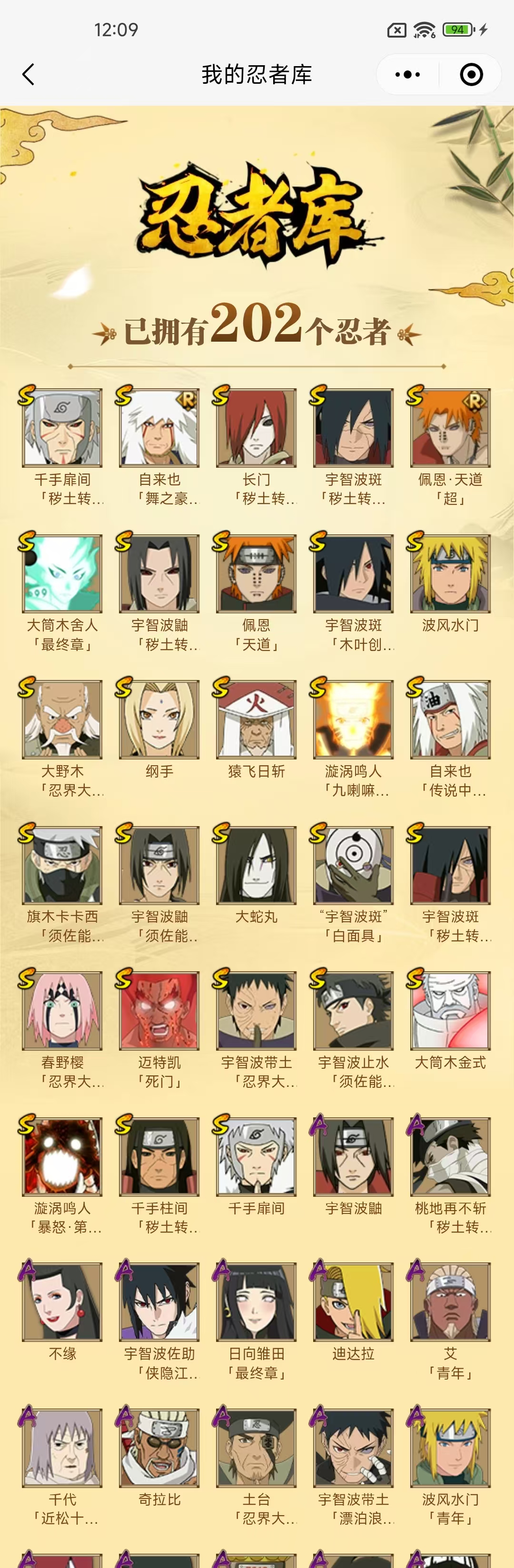 【A忍者】,土台「忍界大战」,不缘,我爱罗「新春限定」,日向雏田「最终章」,黑绝,不动,蝎「绯流琥」,宇智波泉奈,宇智波带土「漂泊浪客」,神农「羁绊」,桃地再不斩「秽土转生」,角都「秽土转生」,长门「青年」,艾「青年」,达鲁伊「五代目雷影」,波风水门「青年」,宇智波佐助「须佐能乎」,小南「新春限定」,千代「近松十人卫」,宇智波鼬「新春限定」,小南「夏日泳装」,大蛇丸「晓」,照美冥「五代目水影」,宇智波佐助「万花筒写轮眼」,奇拉比,飞段「死司凭血」,飞段,迪达拉,我爱罗「疾风传」,蝎,干柿鬼鲛,宇智波鼬,猿飞阿斯玛,迈特凯,桃地再不斩,