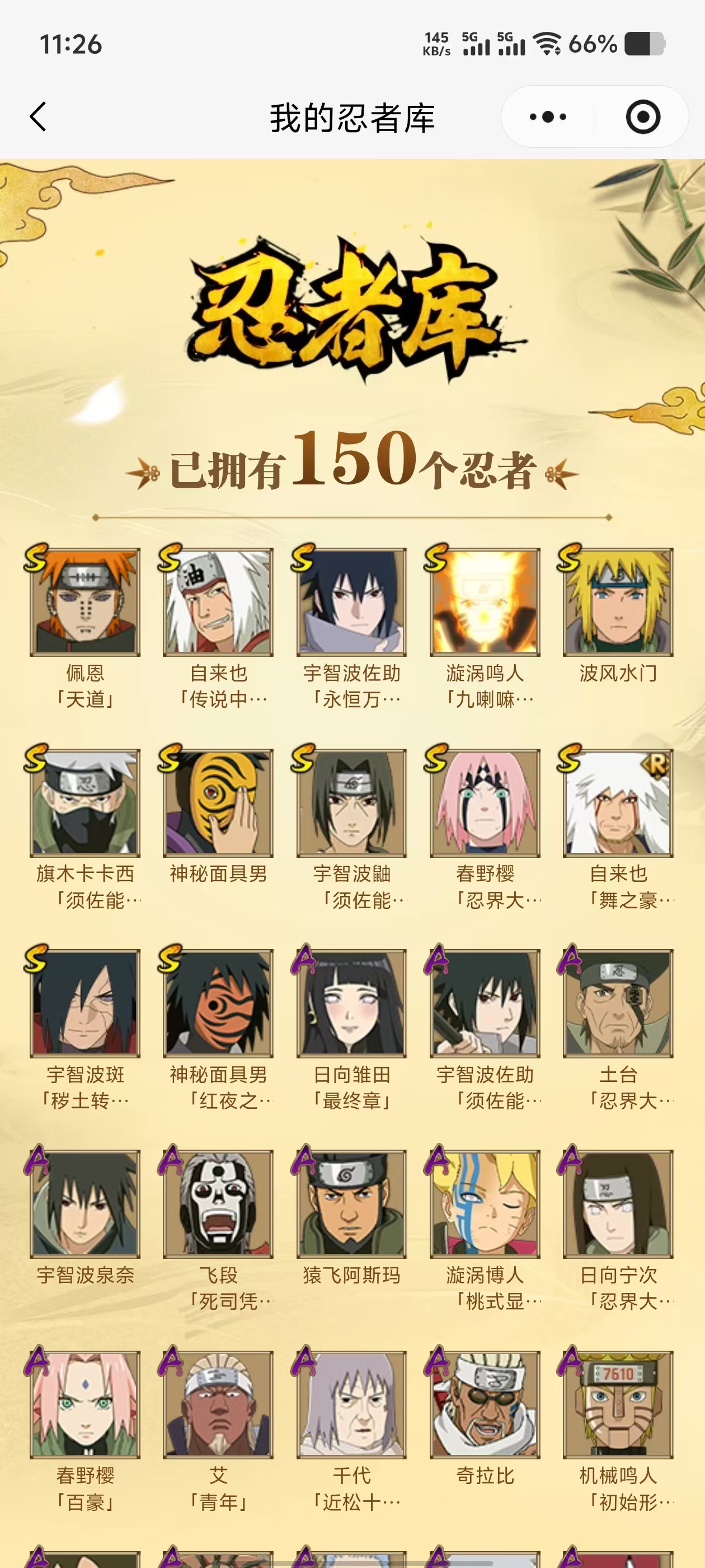 【A忍者】,土台「忍界大战」,长十郎「六代目水影」,日向宁次「忍界大战」,漩涡博人「桃式显现」,日向雏田「最终章」,旗木卡卡西「幻之真容」,小南「漂泊浪客」,蝎「绯流琥」,宇智波泉奈,神农「羁绊」,桃地再不斩「秽土转生」,长门「青年」,艾「青年」,宇智波佐助「须佐能乎」,千代「近松十人卫」,春野樱「百豪」,宇智波佐助「万花筒写轮眼」,奇拉比,飞段「死司凭血」,飞段,我爱罗「疾风传」,蝎,干柿鬼鲛,猿飞阿斯玛,迈特凯,
