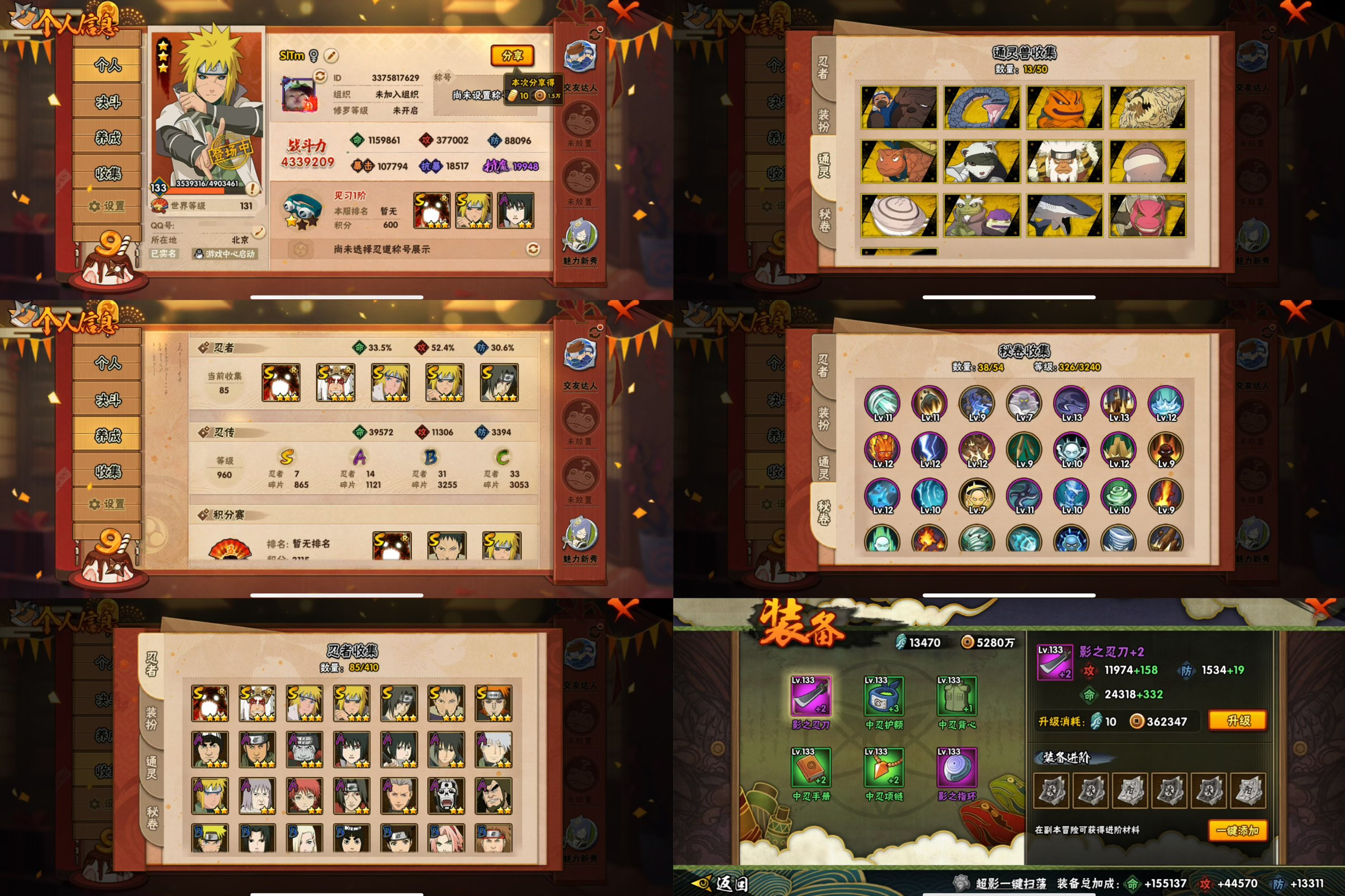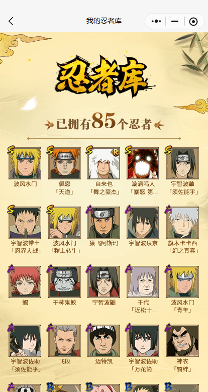 【A忍者】,旗木卡卡西「幻之真容」,宇智波泉奈,神农「羁绊」,波风水门「青年」,宇智波佐助「须佐能乎」,千代「近松十人卫」,宇智波佐助「万花筒写轮眼」,飞段「死司凭血」,飞段,蝎,干柿鬼鲛,宇智波鼬,猿飞阿斯玛,迈特凯,