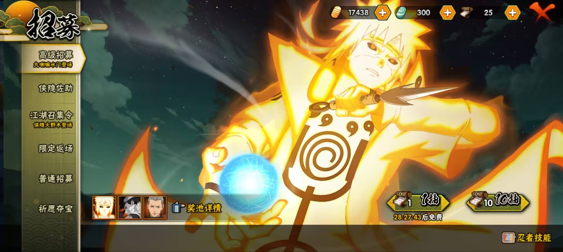 【S忍者】,宇智波止水「须佐能乎」,大筒木桃式,宇智波斑「秽土转生·解」,宇智波佐助「永恒万花筒」,漩涡鸣人「九喇嘛连结」,宇智波斑「木叶创立」,自来也「舞之豪杰」,旗木卡卡西「须佐能乎」,自来也「传说中的三忍」,漩涡鸣人「暴怒·第六尾」,药师兜「仙人模式」,千手扉间「秽土转生」,宇智波鼬「须佐能乎」,佩恩「天道」,波风水门,大蛇丸,