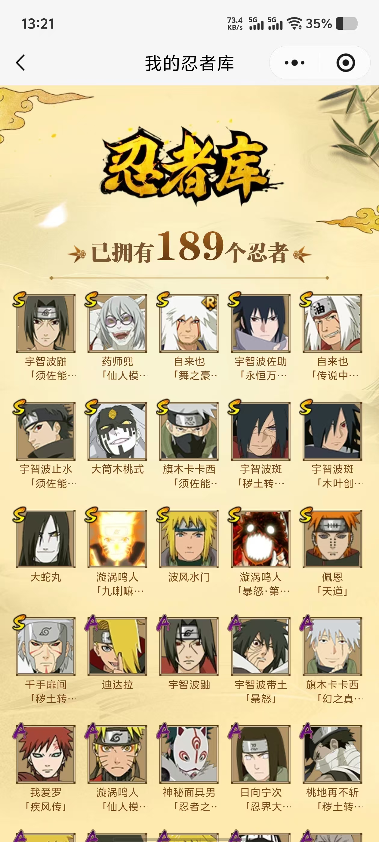 【A忍者】,长十郎「六代目水影」,日向宁次「忍界大战」,漩涡博人「桃式显现」,宇智波鼬「夏日限定」,旗木卡卡西「幻之真容」,李洛克「忍界大战」,蝎「绯流琥」,宇智波泉奈,神农「羁绊」,桃地再不斩「秽土转生」,长门「青年」,艾「青年」,达鲁伊「五代目雷影」,神秘面具男「忍者之路」,波风水门「青年」,宇智波止水「新春限定」,宇智波佐助「须佐能乎」,宇智波带土「暴怒」,照美冥「夏日泳装」,漩涡鸣人「九尾查克拉」,千代「近松十人卫」,药师兜「半蛇斗篷」,宇智波鼬「新春限定」,宇智波佐助「疾风传咒印」,小南「夏日泳装」,秋道丁次「忍界大战」,大蛇丸「晓」,猿飞阿斯玛「秽土转生」,波风水门「新春限定」,照美冥「五代目水影」,宇智波佐助「万花筒写轮眼」,漩涡鸣人「仙人模式」,角都「地怨虞」,飞段「死司凭血」,飞段,迪达拉,我爱罗「疾风传」,蝎,干柿鬼鲛,宇智波鼬,猿飞阿斯玛,迈特凯,