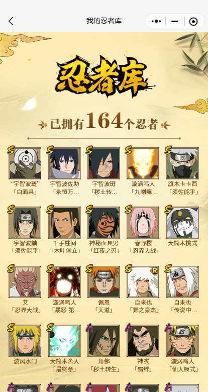 【A忍者】,土台「忍界大战」,长十郎「六代目水影」,日向宁次「忍界大战」,漩涡博人「桃式显现」,宇智波鼬「夏日限定」,日向雏田「最终章」,旗木卡卡西「幻之真容」,李洛克「忍界大战」,黑绝,蝎「绯流琥」,宇智波泉奈,神农「羁绊」,桃地再不斩「秽土转生」,角都「秽土转生」,长门「青年」,波风水门「青年」,宇智波佐助「须佐能乎」,漩涡鸣人「九尾查克拉」,千代「近松十人卫」,秋道丁次「忍界大战」,猿飞阿斯玛「秽土转生」,宇智波佐助「万花筒写轮眼」,漩涡鸣人「仙人模式」,飞段「死司凭血」,飞段,迪达拉,我爱罗「疾风传」,蝎,干柿鬼鲛,宇智波鼬,猿飞阿斯玛,迈特凯,