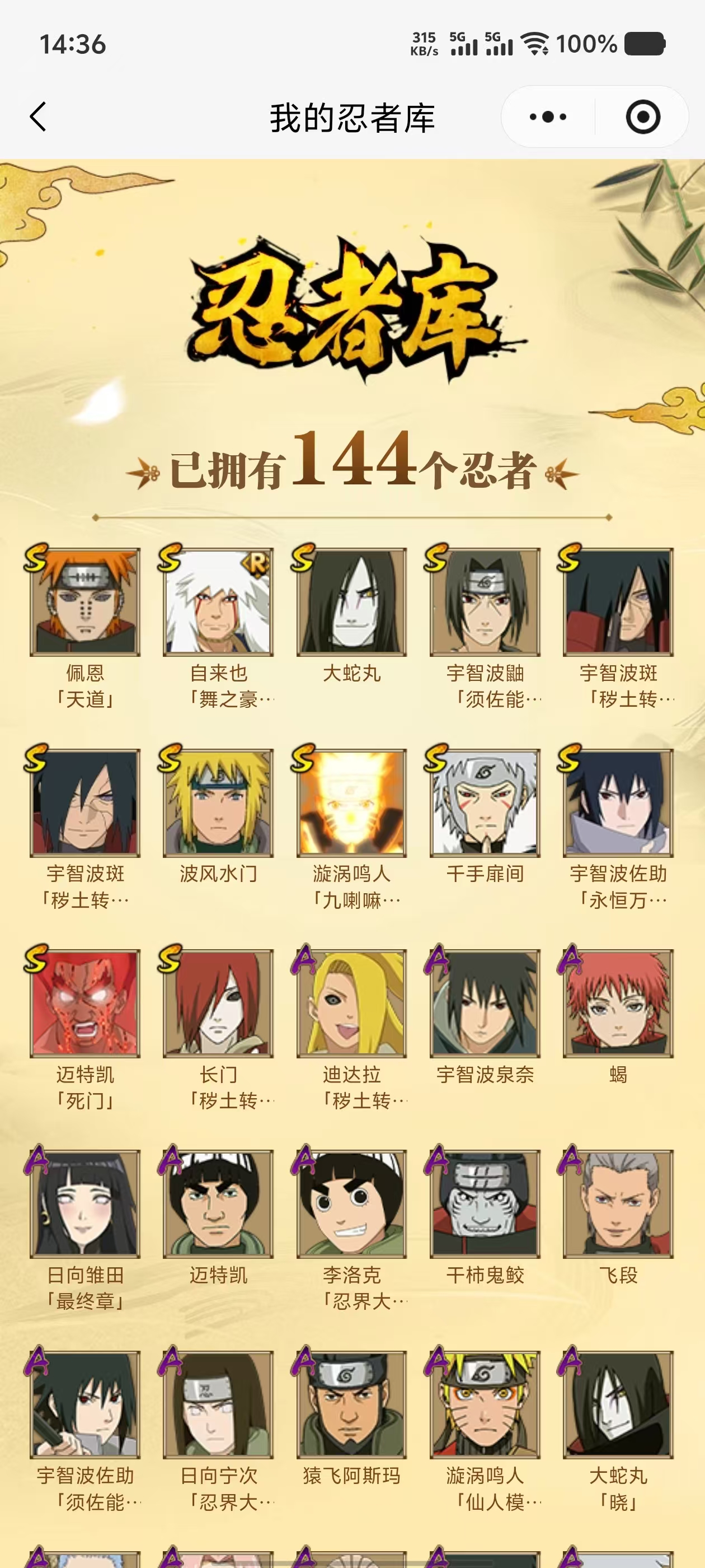 【A忍者】,长十郎「六代目水影」,日向宁次「忍界大战」,漩涡博人「桃式显现」,日向雏田「最终章」,李洛克「忍界大战」,宇智波泉奈,艾「青年」,宇智波佐助「须佐能乎」,迪达拉「秽土转生」,大蛇丸「晓」,春野樱「百豪」,照美冥「五代目水影」,宇智波佐助「万花筒写轮眼」,奇拉比,漩涡鸣人「仙人模式」,旗木卡卡西「万花筒写轮眼」,飞段「死司凭血」,飞段,我爱罗「疾风传」,蝎,干柿鬼鲛,宇智波鼬,猿飞阿斯玛,迈特凯,