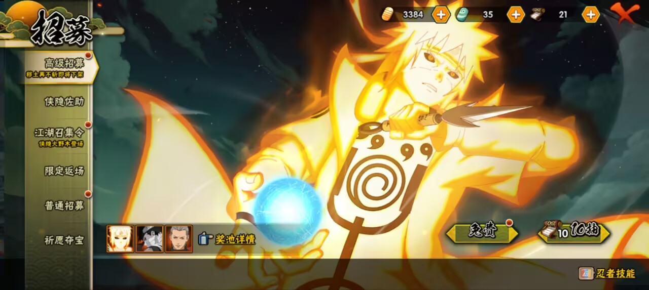 【S忍者】,宇智波止水「须佐能乎」,大筒木桃式,宇智波斑「秽土转生·解」,迈特凯「死门」,自来也「舞之豪杰」,旗木卡卡西「须佐能乎」,漩涡鸣人「暴怒·第六尾」,药师兜「仙人模式」,宇智波斑,宇智波鼬「须佐能乎」,佩恩「天道」,波风水门,