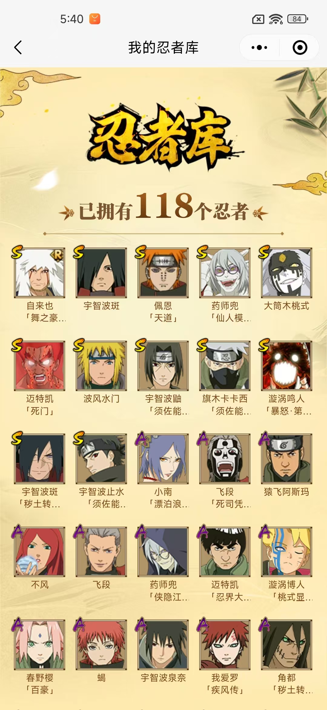 【A忍者】,药师兜「侠隐江湖」,日向宁次「忍界大战」,漩涡博人「桃式显现」,小南「漂泊浪客」,李洛克「忍界大战」,宇智波泉奈,神农「羁绊」,桃地再不斩「秽土转生」,角都「秽土转生」,不风,迈特凯「忍界大战」,秋道丁次「忍界大战」,春野樱「百豪」,飞段「死司凭血」,飞段,迪达拉,我爱罗「疾风传」,蝎,干柿鬼鲛,宇智波鼬,猿飞阿斯玛,迈特凯,