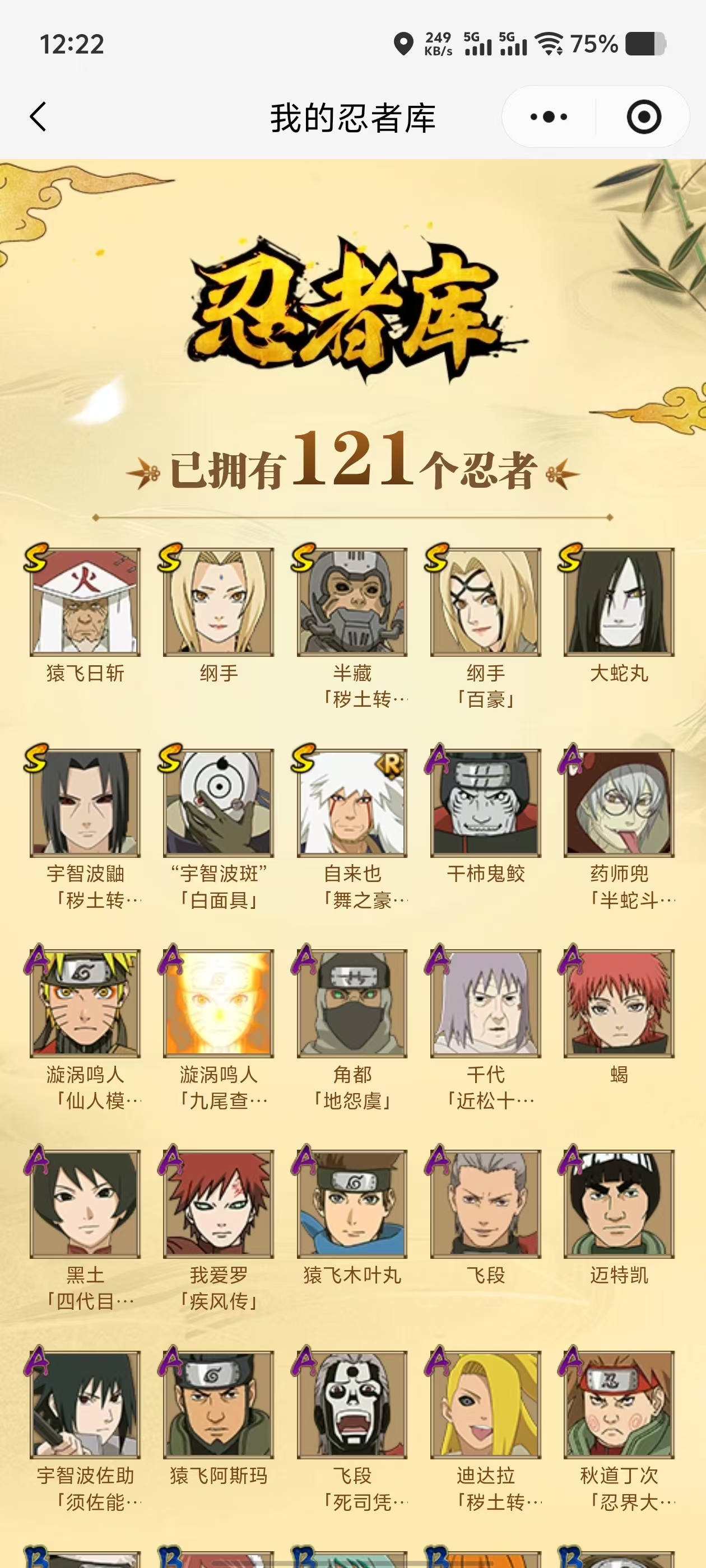 【A忍者】,宇智波佐助「须佐能乎」,迪达拉「秽土转生」,漩涡鸣人「九尾查克拉」,千代「近松十人卫」,药师兜「半蛇斗篷」,秋道丁次「忍界大战」,漩涡鸣人「仙人模式」,角都「地怨虞」,飞段「死司凭血」,飞段,我爱罗「疾风传」,蝎,干柿鬼鲛,猿飞阿斯玛,迈特凯,