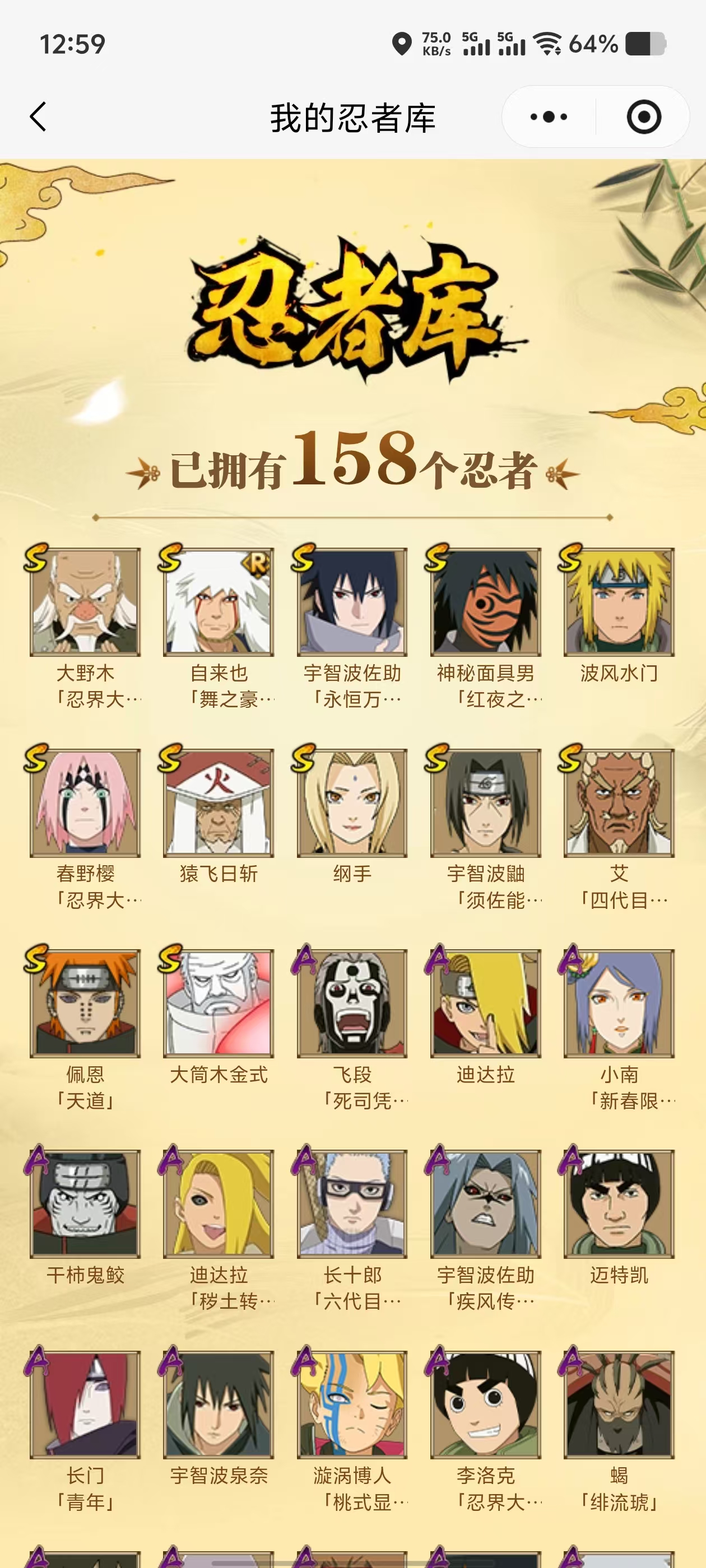 【A忍者】,长十郎「六代目水影」,日向宁次「忍界大战」,漩涡博人「桃式显现」,旗木卡卡西「幻之真容」,李洛克「忍界大战」,蝎「绯流琥」,宇智波泉奈,角都「秽土转生」,长门「青年」,佩恩·六道「漂泊浪客」,迪达拉「秽土转生」,小南「新春限定」,千代「近松十人卫」,宇智波佐助「疾风传咒印」,秋道丁次「忍界大战」,照美冥「五代目水影」,飞段「死司凭血」,飞段,迪达拉,我爱罗「疾风传」,蝎,干柿鬼鲛,宇智波鼬,猿飞阿斯玛,迈特凯,卑留呼「火之意志继承者」,