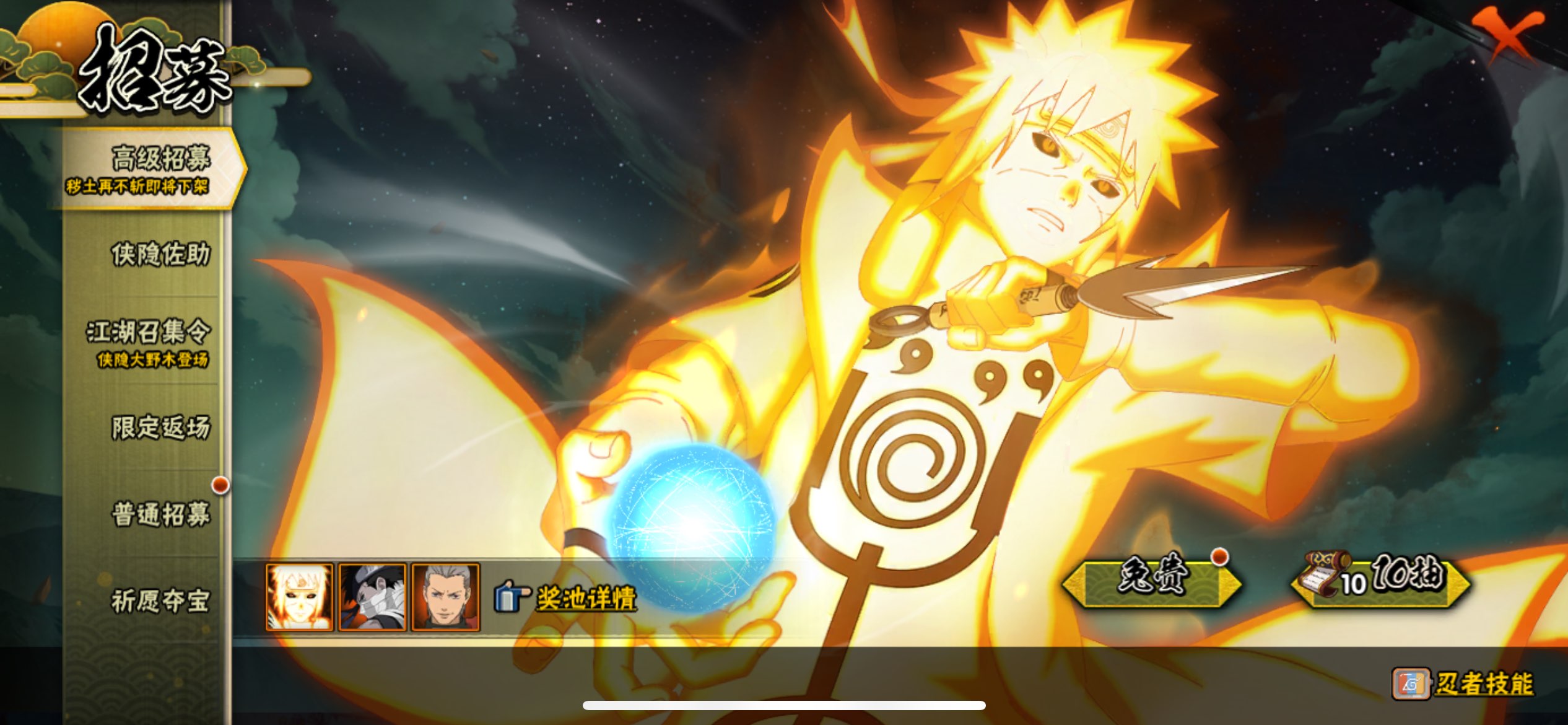 【S忍者】,艾「忍界大战」,自来也「舞之豪杰」,自来也「传说中的三忍」,漩涡鸣人「暴怒·第六尾」,宇智波鼬「须佐能乎」,佩恩「天道」,波风水门「九喇嘛连结」,