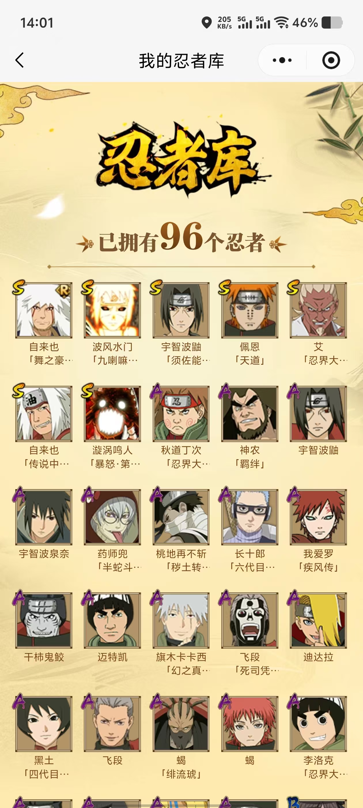 【A忍者】,土台「忍界大战」,长十郎「六代目水影」,不缘,漩涡博人「桃式显现」,旗木卡卡西「幻之真容」,李洛克「忍界大战」,蝎「绯流琥」,宇智波泉奈,神农「羁绊」,桃地再不斩「秽土转生」,药师兜「半蛇斗篷」,秋道丁次「忍界大战」,飞段「死司凭血」,飞段,迪达拉,我爱罗「疾风传」,蝎,干柿鬼鲛,宇智波鼬,猿飞阿斯玛,迈特凯,