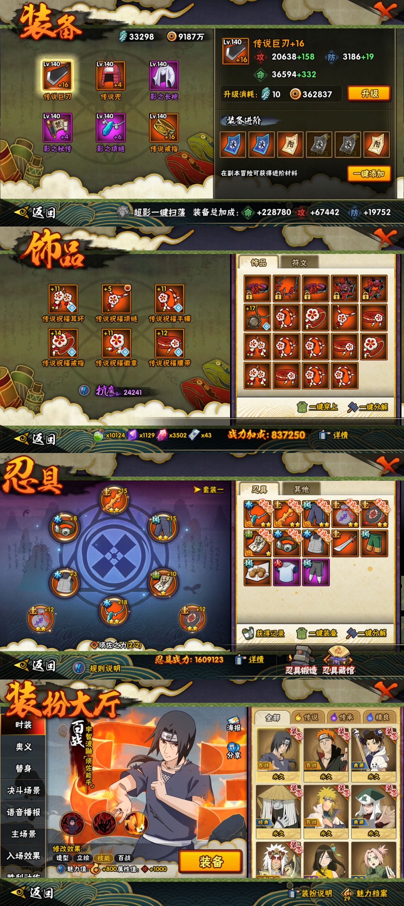 【A忍者】,日向宁次「忍界大战」,漩涡博人「桃式显现」,日向雏田「最终章」,旗木卡卡西「幻之真容」,李洛克「忍界大战」,宇智波泉奈,宇智波带土「漂泊浪客」,宇智波佐助「须佐能乎」,千代「近松十人卫」,我爱罗「忍界大战」,秋道丁次「忍界大战」,猿飞日斩「火影继承人」,飞段「死司凭血」,迪达拉,我爱罗「疾风传」,蝎,干柿鬼鲛,宇智波鼬,猿飞阿斯玛,迈特凯,