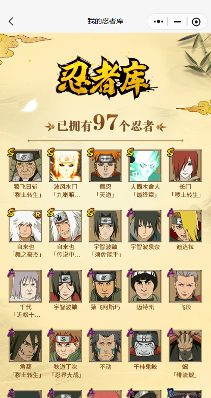 【S忍者】,自来也「舞之豪杰」,大筒木舍人「最终章」,自来也「传说中的三忍」,猿飞日斩「秽土转生」,长门「秽土转生」,宇智波鼬「须佐能乎」,佩恩「天道」,波风水门「九喇嘛连结」,