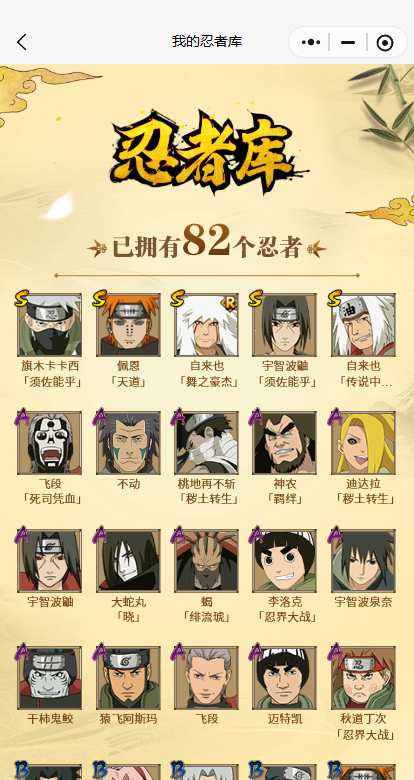【A忍者】,李洛克「忍界大战」,不动,蝎「绯流琥」,宇智波泉奈,神农「羁绊」,桃地再不斩「秽土转生」,迪达拉「秽土转生」,秋道丁次「忍界大战」,大蛇丸「晓」,飞段「死司凭血」,飞段,干柿鬼鲛,宇智波鼬,猿飞阿斯玛,迈特凯,