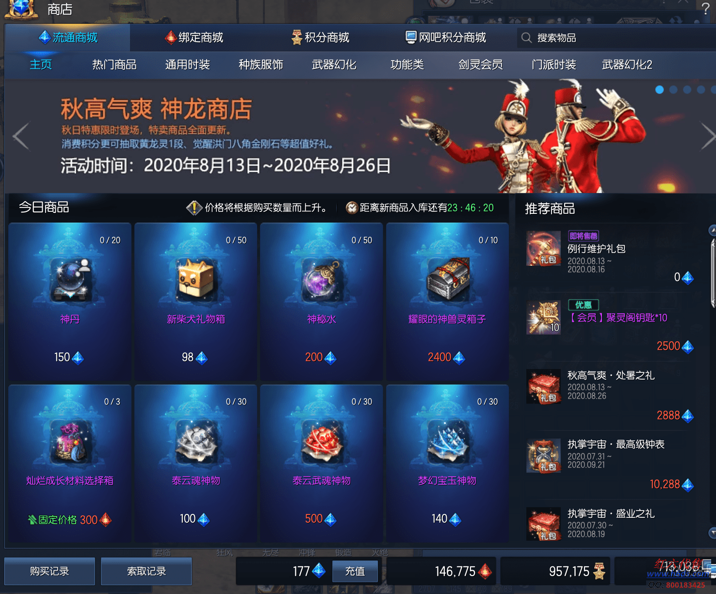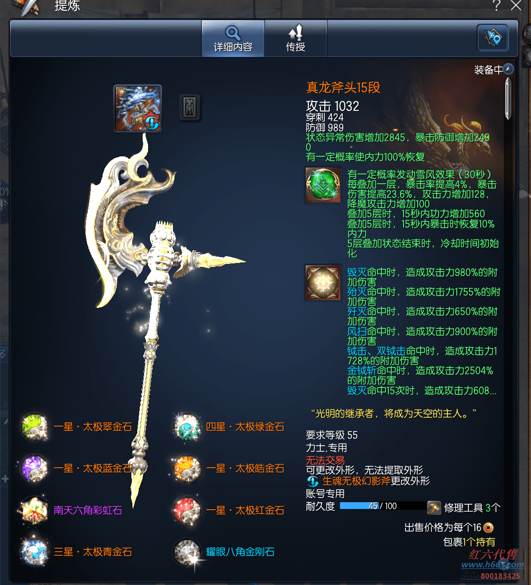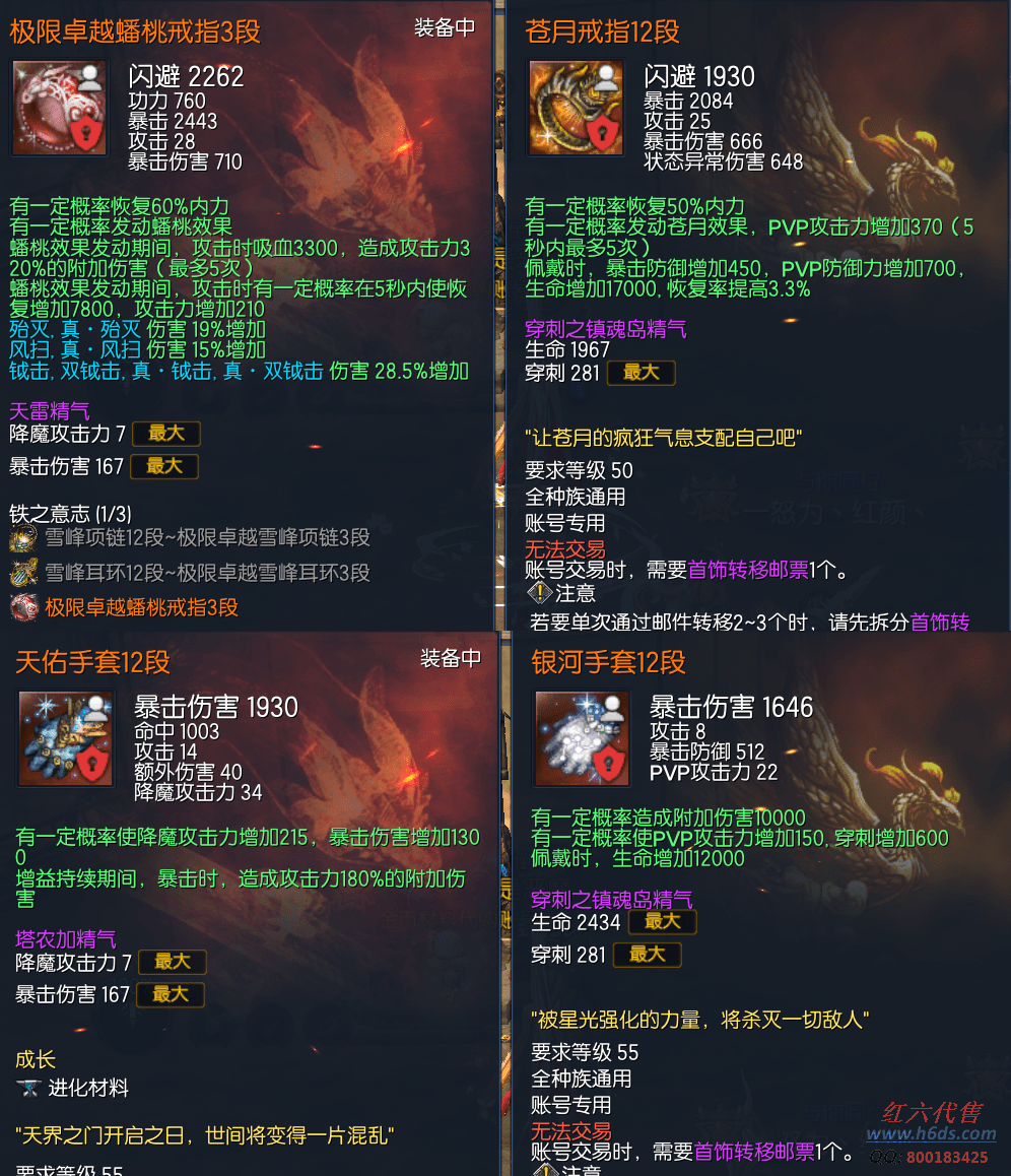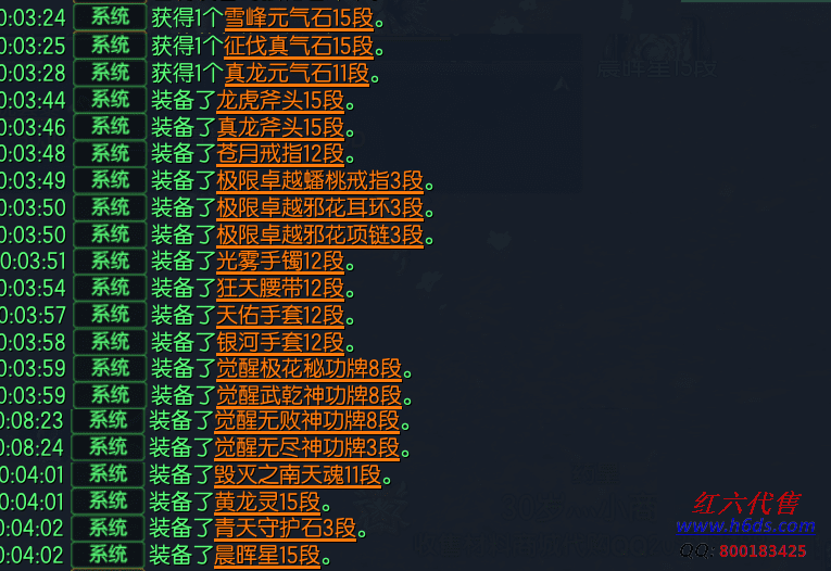 12300,侠义团104段,四星太极石,三星太极石,一星太极石x4,雪峰元气石15段,征伐真气石15段,真龙元气石11段,龙虎斧头15段,真龙斧头15段,苍月戒指12段,卓越蟠桃戒指3段,卓越邪花耳环3段,卓越邪花项链3段,光雾手镯12段,狂天腰带12段,天佑手套12段,银河手套12段,极花秘功牌8段,武乾神功牌8段,无败神功牌8段,无尽神功牌3段,毁灭南天魂11段,黄龙灵15段,青天守护石3段,晨晖星15段,衣服341,《送点券14万》11500R,