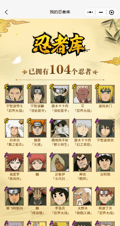【A忍者】,漩涡博人「桃式显现」,旗木卡卡西「幻之真容」,李洛克「忍界大战」,蝎「绯流琥」,宇智波泉奈,神农「羁绊」,桃地再不斩「秽土转生」,达鲁伊「五代目雷影」,宇智波佐助「须佐能乎」,千代「近松十人卫」,药师兜「半蛇斗篷」,秋道丁次「忍界大战」,飞段「死司凭血」,飞段,迪达拉,我爱罗「疾风传」,蝎,干柿鬼鲛,宇智波鼬,猿飞阿斯玛,迈特凯,