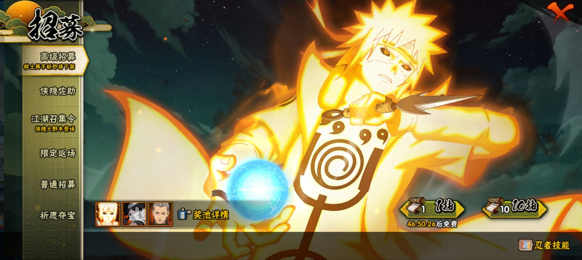 【S忍者】,宇智波斑「秽土转生·解」,自来也「舞之豪杰」,旗木卡卡西「须佐能乎」,自来也「传说中的三忍」,宇智波鼬「须佐能乎」,佩恩「天道」,波风水门,