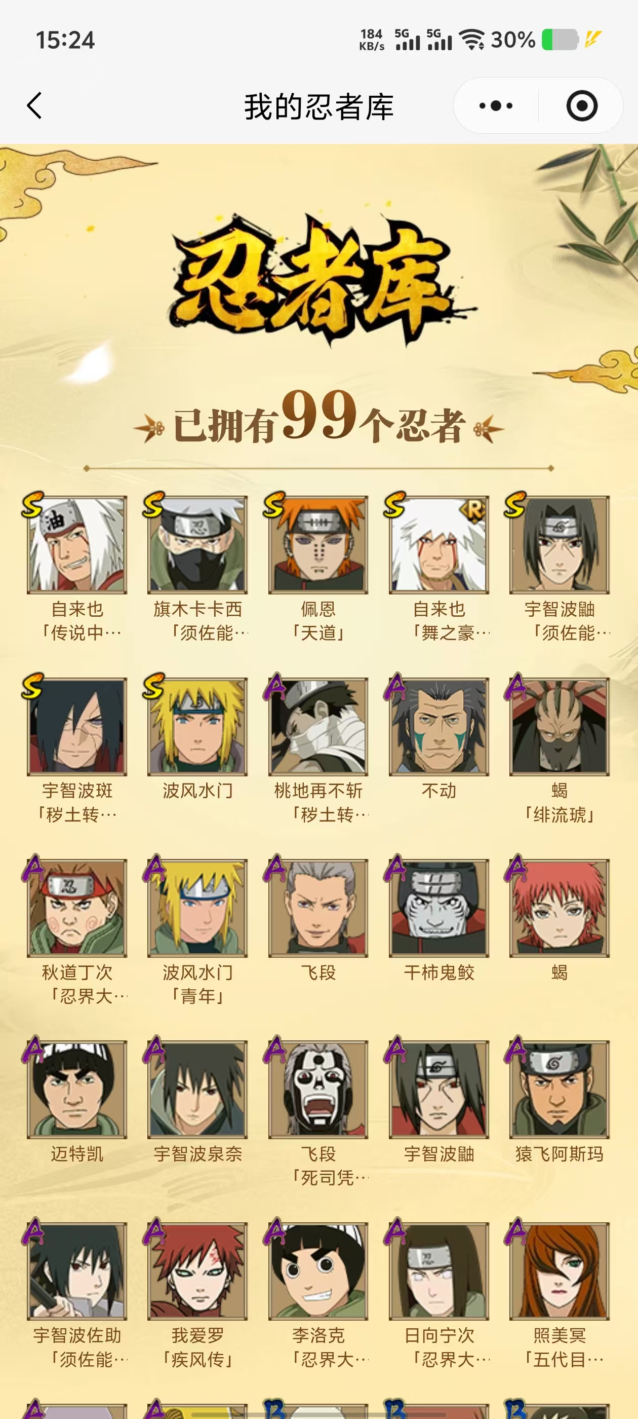 【A忍者】,日向宁次「忍界大战」,李洛克「忍界大战」,不动,蝎「绯流琥」,宇智波泉奈,桃地再不斩「秽土转生」,波风水门「青年」,宇智波佐助「须佐能乎」,千代「近松十人卫」,秋道丁次「忍界大战」,照美冥「五代目水影」,飞段「死司凭血」,飞段,迪达拉,我爱罗「疾风传」,蝎,干柿鬼鲛,宇智波鼬,猿飞阿斯玛,迈特凯,