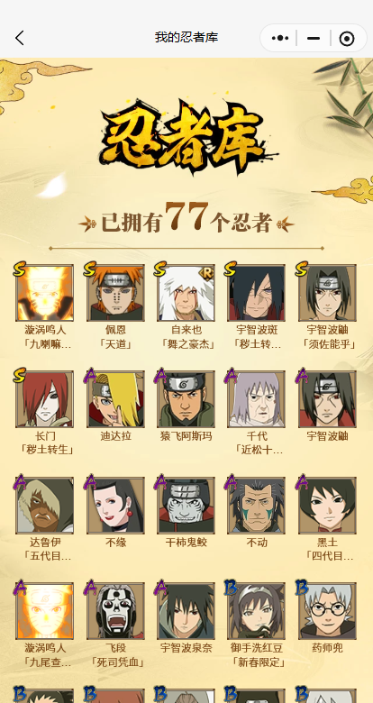 PX_2228552-6S忍/12A忍/战力310W/V1/区服4075 【S忍者】,宇智波斑「秽土转生·解」,漩涡鸣人「九喇嘛连结」,自来也「舞之豪杰」,长门「秽土转生」,宇智波鼬「须佐能乎」,佩恩「天道」, 【A忍者】,不缘,不动,宇智波泉奈,达鲁伊「五代目雷影」,漩涡鸣人「九尾查克拉」,千代「近松十人卫」,飞段「死司凭血」,迪达拉,干柿鬼鲛,宇智波鼬,猿飞阿斯玛,