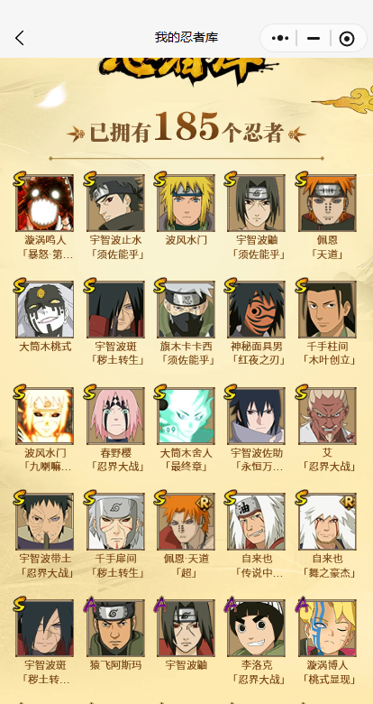 【A忍者】,纲手「侠隐江湖」,长十郎「六代目水影」,不缘,日向宁次「忍界大战」,漩涡博人「桃式显现」,小南「漂泊浪客」,李洛克「忍界大战」,蝎「绯流琥」,宇智波泉奈,宇智波带土「漂泊浪客」,神农「羁绊」,桃地再不斩「秽土转生」,角都「秽土转生」,佩恩·六道「漂泊浪客」,照美冥「侠隐江湖」,波风水门「青年」,迈特凯「忍界大战」,千代「近松十人卫」,宇智波佐助「疾风传咒印」,小南「夏日泳装」,秋道丁次「忍界大战」,飞段「死司凭血」,飞段,迪达拉,我爱罗「疾风传」,蝎,干柿鬼鲛,宇智波鼬,猿飞阿斯玛,迈特凯,旗木卡卡西,